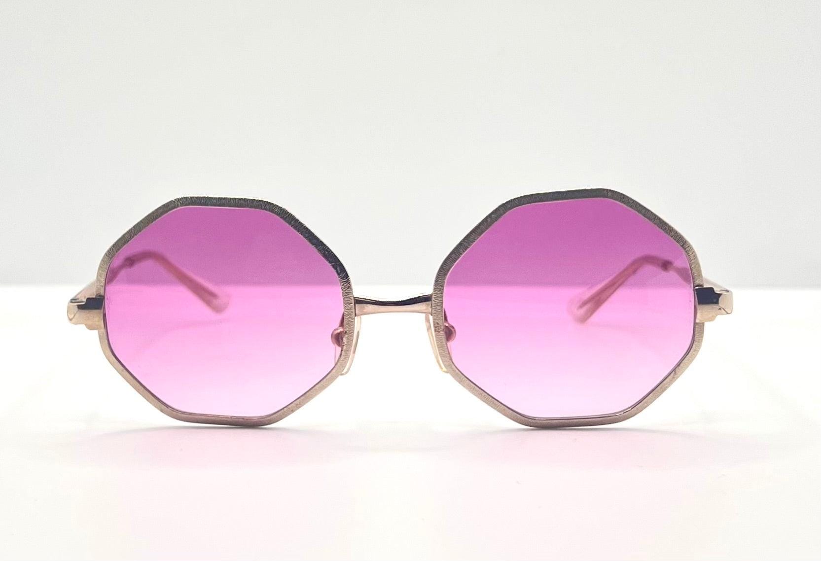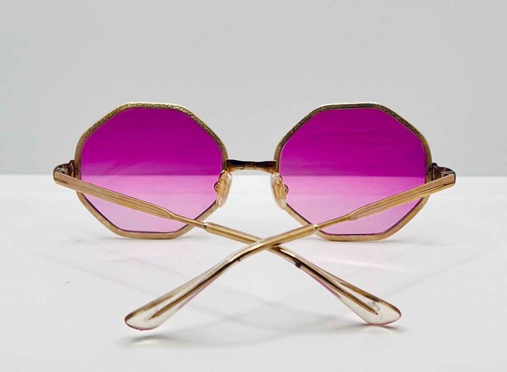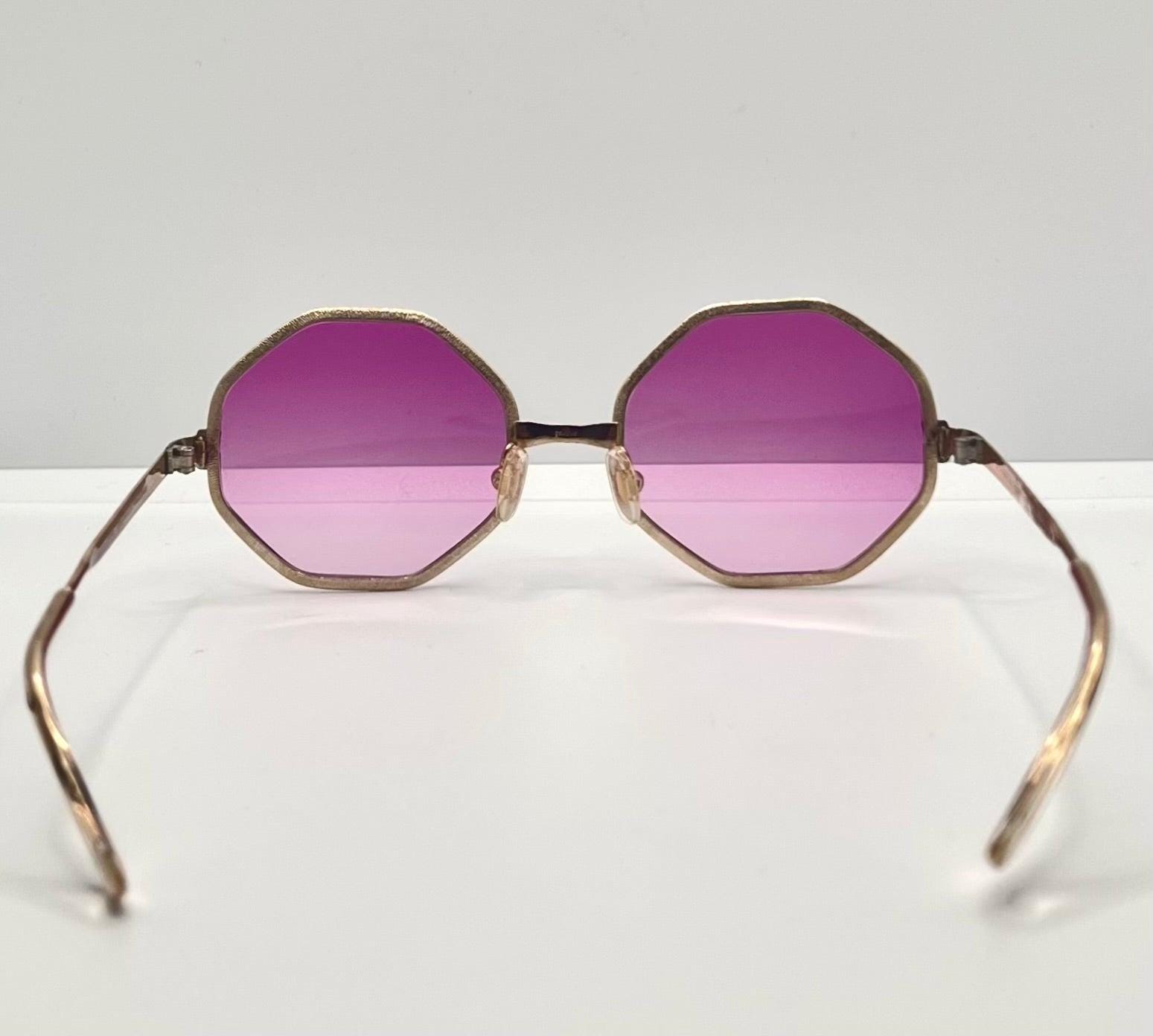 Color: Gold-tone metal frame with original pink/purple tinted lenses