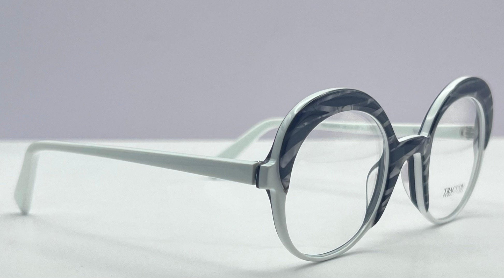 From the visionary minds at Traction Productions, the Palmaria model blends sculptural artistry with high-fashion minimalism. This handmade French frame features a bold round silhouette with a layered acetate design in white and black, offering a striking contrast from every angle.