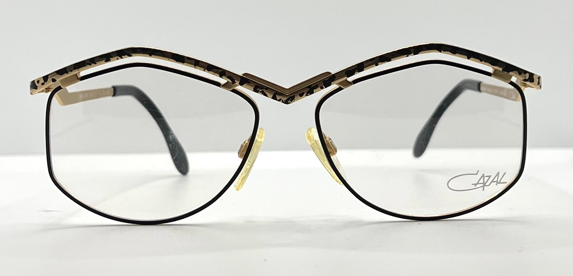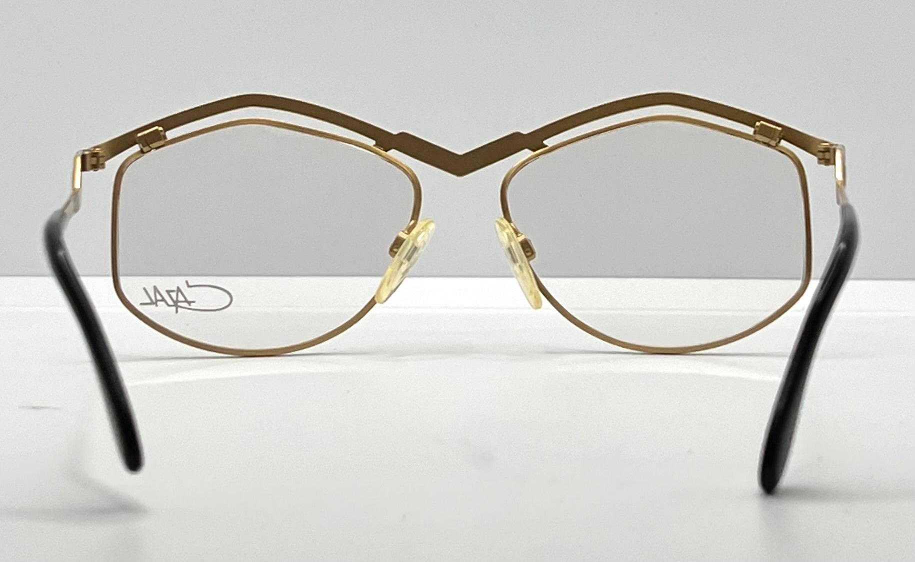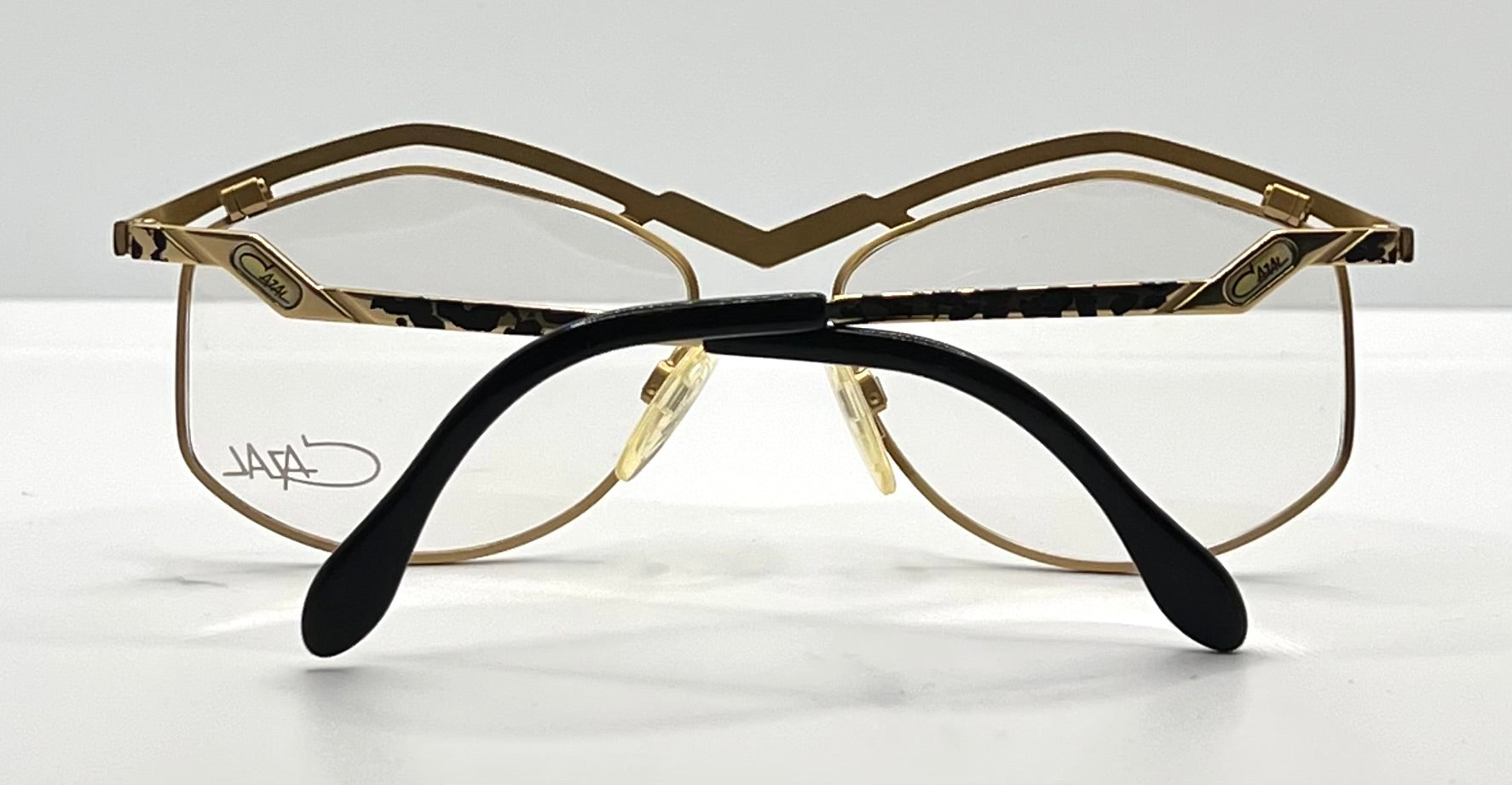 The MOD 249 is an elusive titanium model highly sought by collectors and fashion-forward stylists. Its bold architecture, leopard-accented gold finish, and asymmetric browline distinguish it from more common Cazal models, making it a standout piece from the era when Cazal dominated luxury eyewear and streetwear fashion.