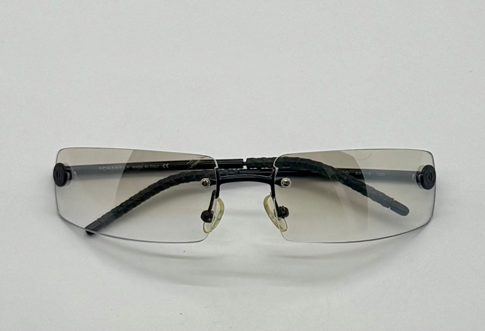 This model is part of Chanel’s early-2000s rimless era — known for bold rectangular lenses mounted through signature oversized double-C disc hardware.