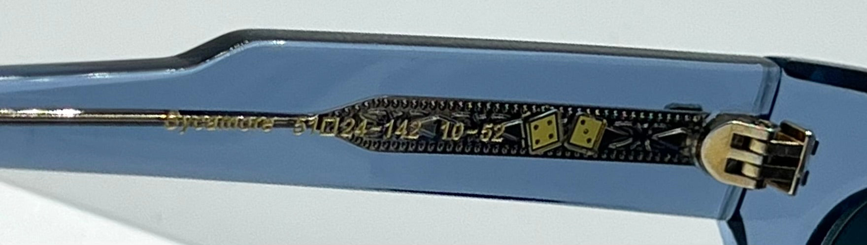 Entourage of 7 is a premium eyewear label celebrated for its bold acetate hues, intricate metal detailing, and meticulous Japanese craftsmanship. The SYCAMORE in Ice Blue showcases the brand’s signature fusion of creativity and precision—its translucent frame reveals the custom dice-themed core wire, offering both visual intrigue and collector appeal. Stylish yet versatile, it’s ideal for those who appreciate luxury with individuality.