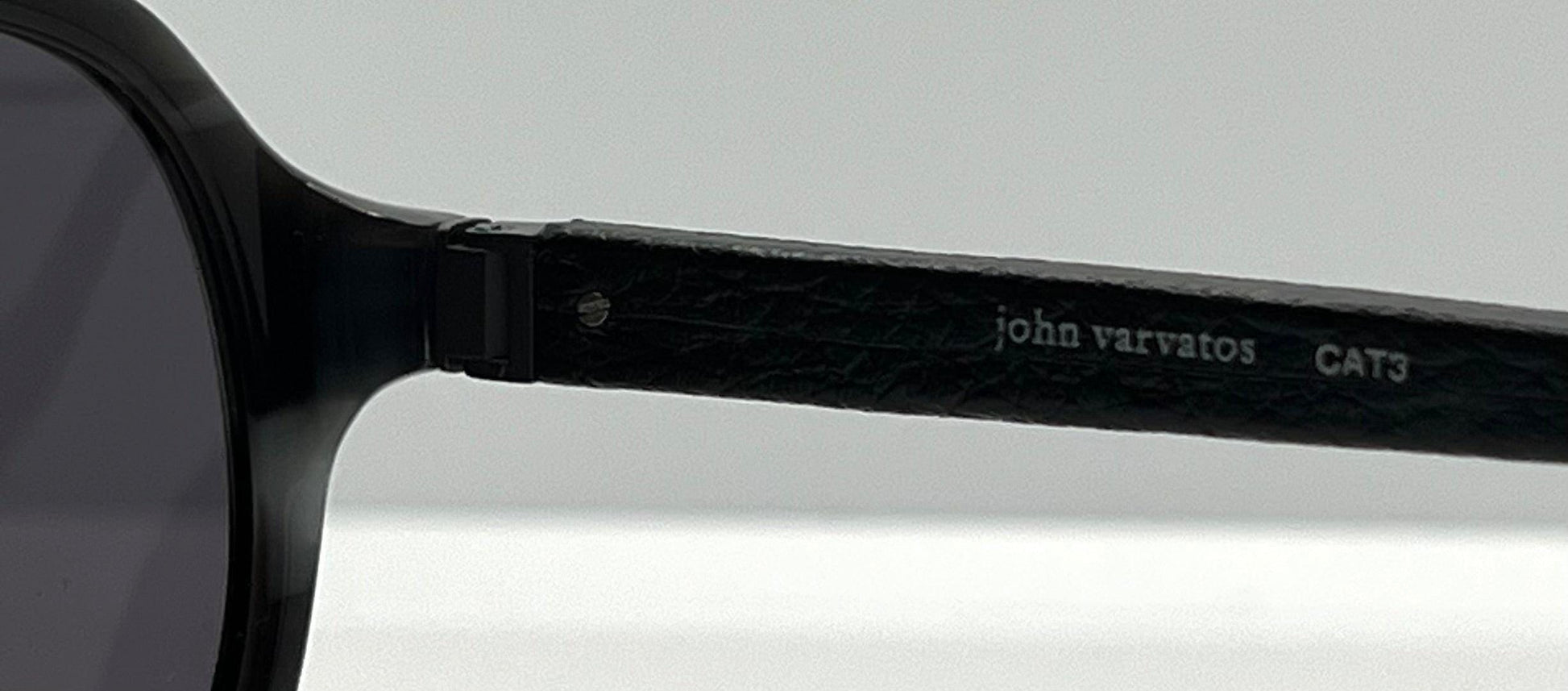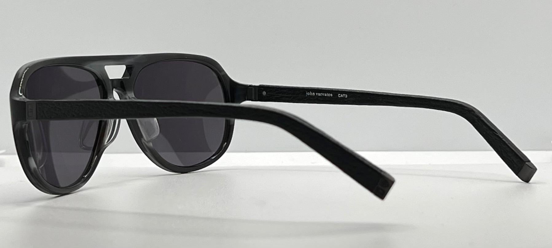 A rare find for fans of John Varvatos’ refined rock aesthetic, these brand-new, unworn sunglasses feature a sharp aviator silhouette with a bold keyhole bridge and genuine leather-wrapped temples, offering a sophisticated nod to vintage design. The Black/Grey Horn acetate pattern mimics natural horn, creating depth and character without using animal materials.