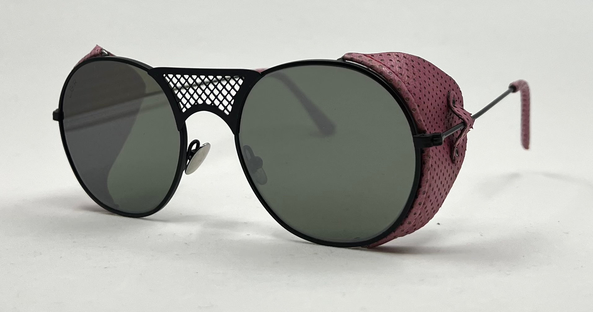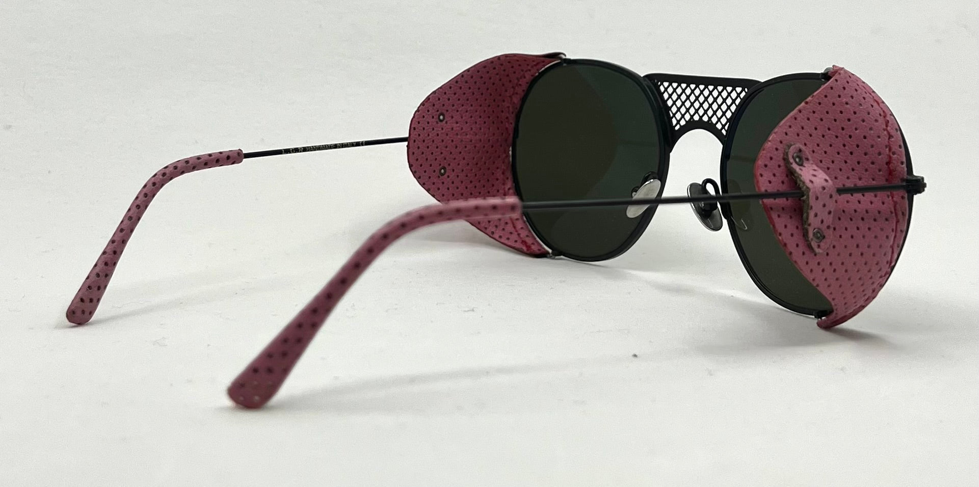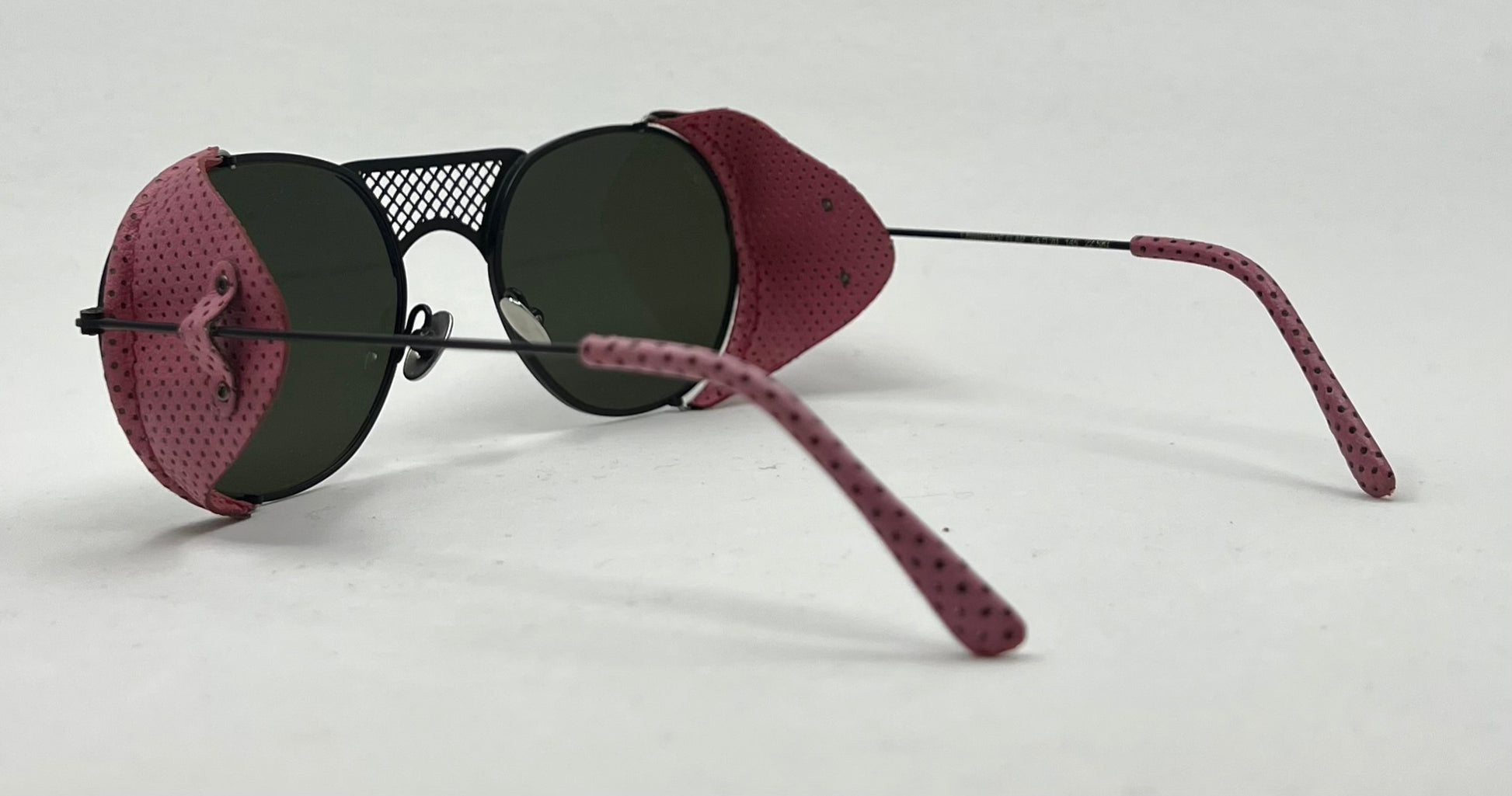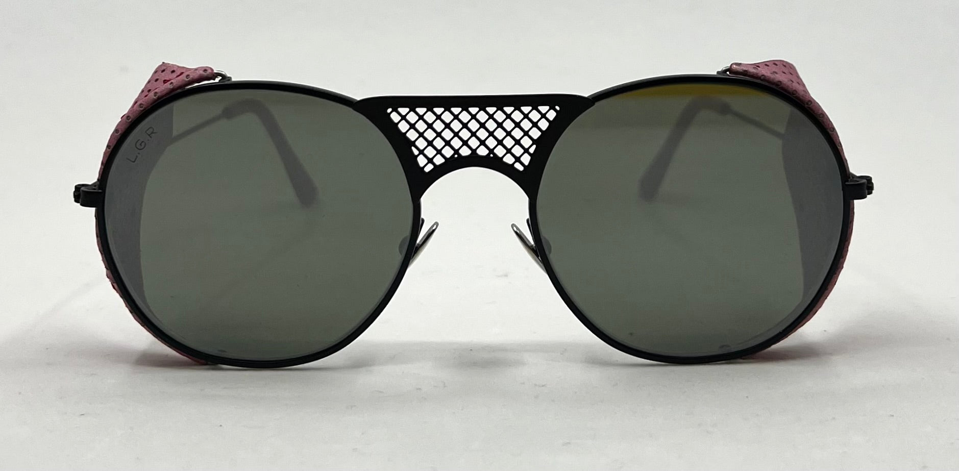 A highly uncommon configuration of L.G.R’s iconic Lawrence Flap—a handmade Italian expedition-style frame designed for extreme light conditions and rugged travel. This model features a black metal chassis paired with rare pink perforated leather side flaps and matching leather-wrapped temple tips, creating a striking contrast not typically offered in standard L.G.R colorways.