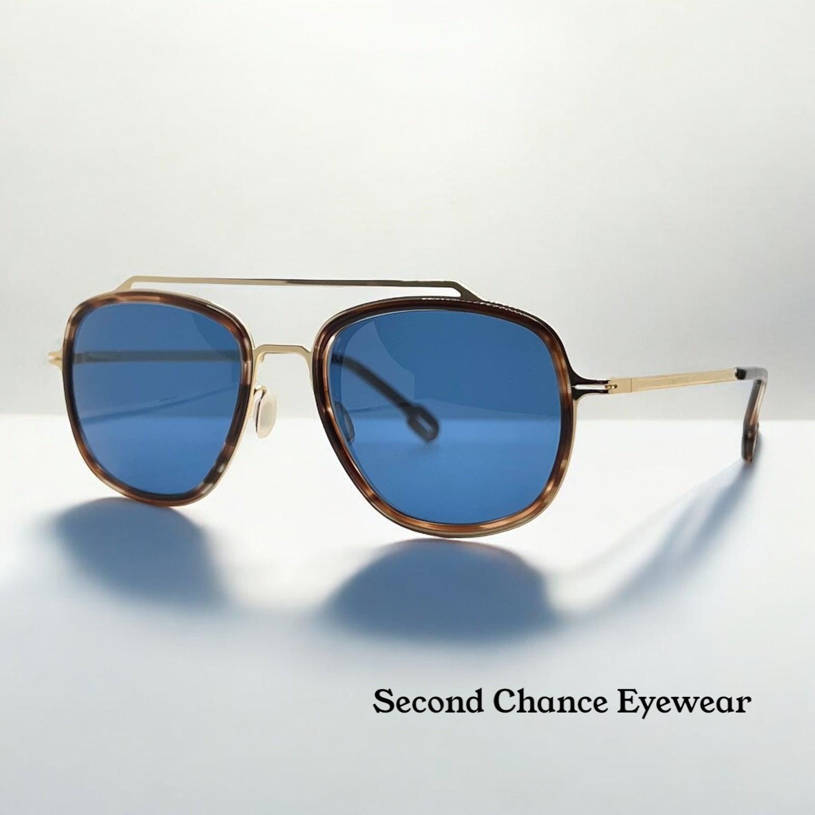 A stunning expression of modern European artistry with vintage-inspired sophistication. The Odette Lunettes “Trent” C308, designed in Antwerp, Belgium, combines bold geometric structure with refined detailing. Handcrafted with a polished gold-tone metal frame, tortoiseshell brow bar, and custom blue lenses, this piece exemplifies contemporary elegance and timeless wearability.