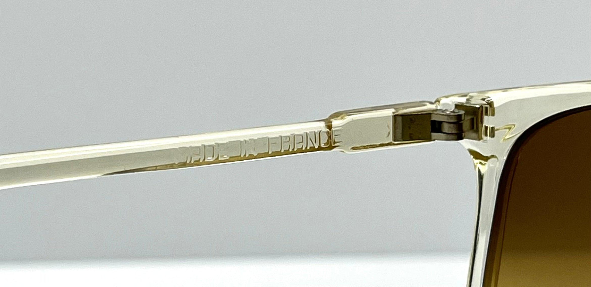 A striking vintage French cat-eye, crafted from high-quality translucent champagne acetate. This oversized silhouette features a wide front with gentle brow lift, exemplifying the elegance and subtle glamour of late 1970s–mid-1980s French eyewear. Likely sold through high-end optical boutiques in Paris and Milan, this frame is a testament to classic French craftsmanship.