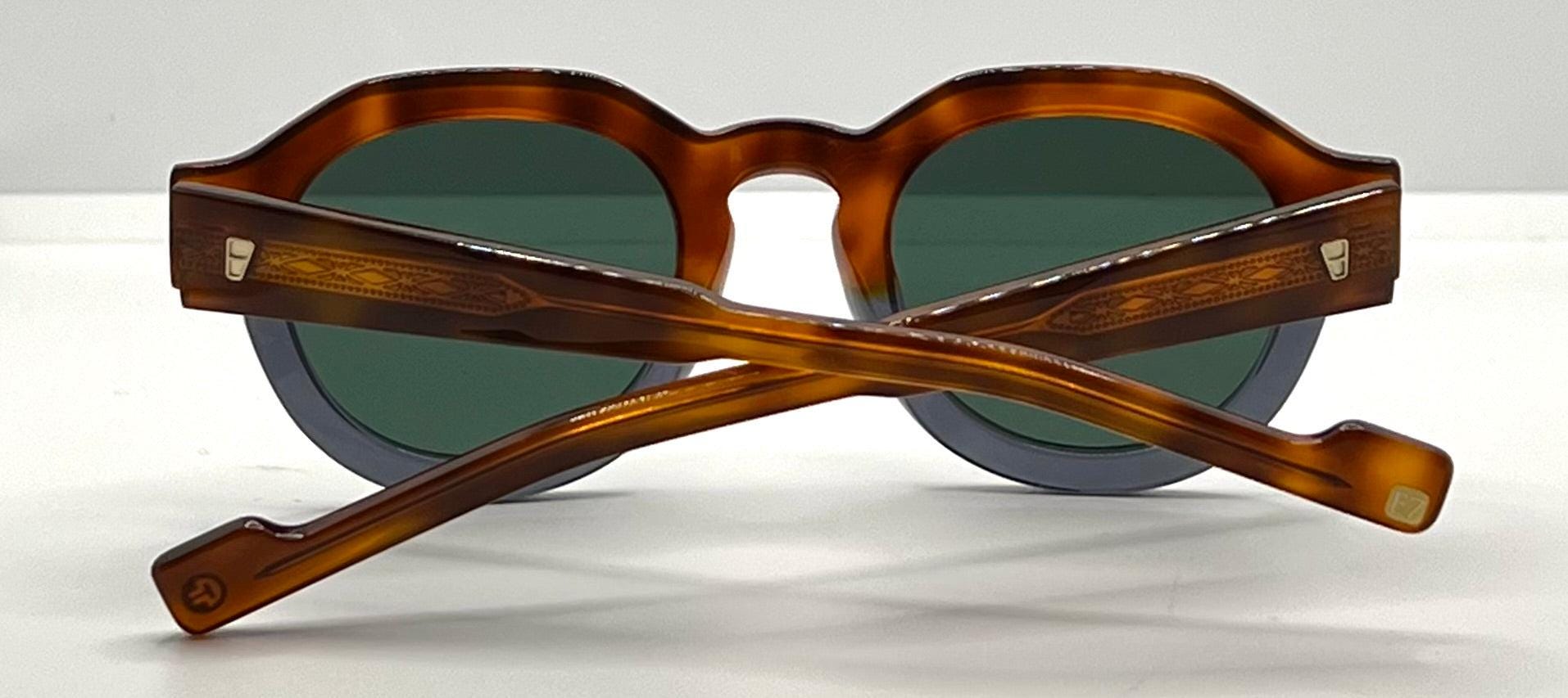 Design Features: Bold rounded front with sculpted brow detail, rich tortoise upper transitioning to smoky grey lower rim, and vintage-inspired paddle temple tips for comfort and stability.