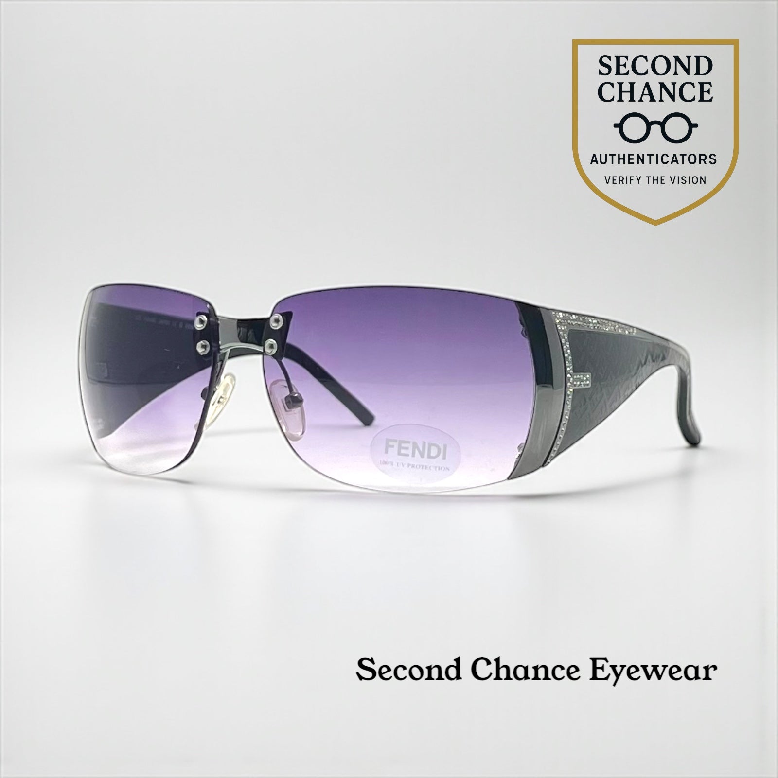 A true Deadstock Japan-made FENDI FS349R shield from the late-2000s Y2K luxury era. Featuring an oversized purple gradient shield lens, sculpted FF-monogram temples, and rhinestone-set Fendi “F” corner plates, this pair represents one of Fendi’s most iconic couture silhouettes.