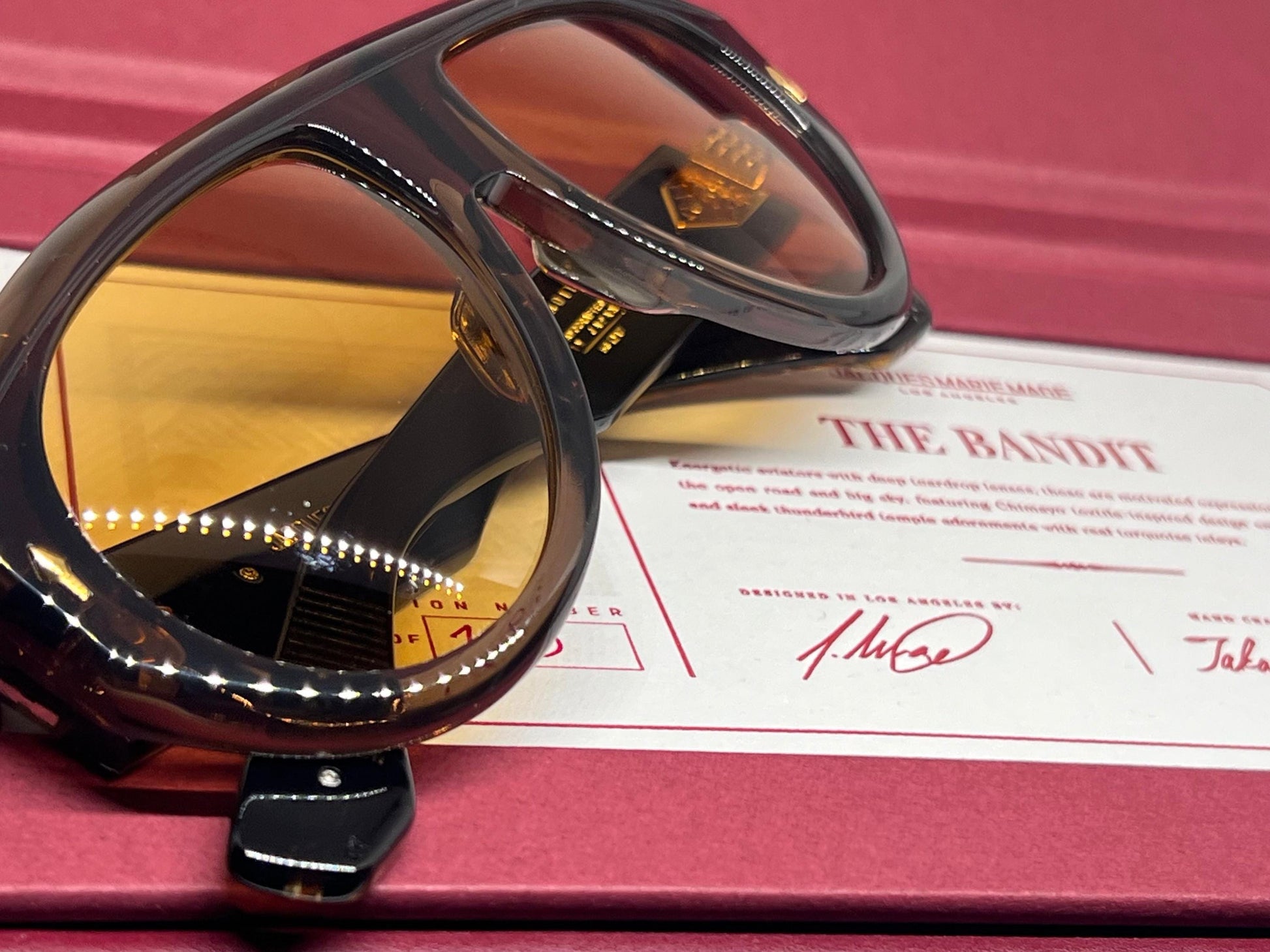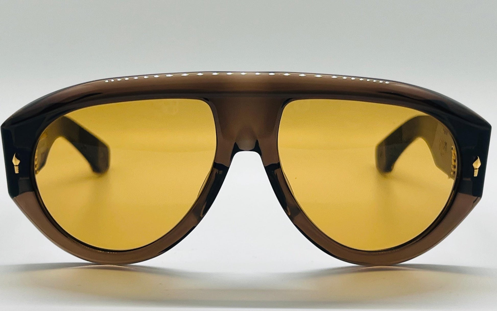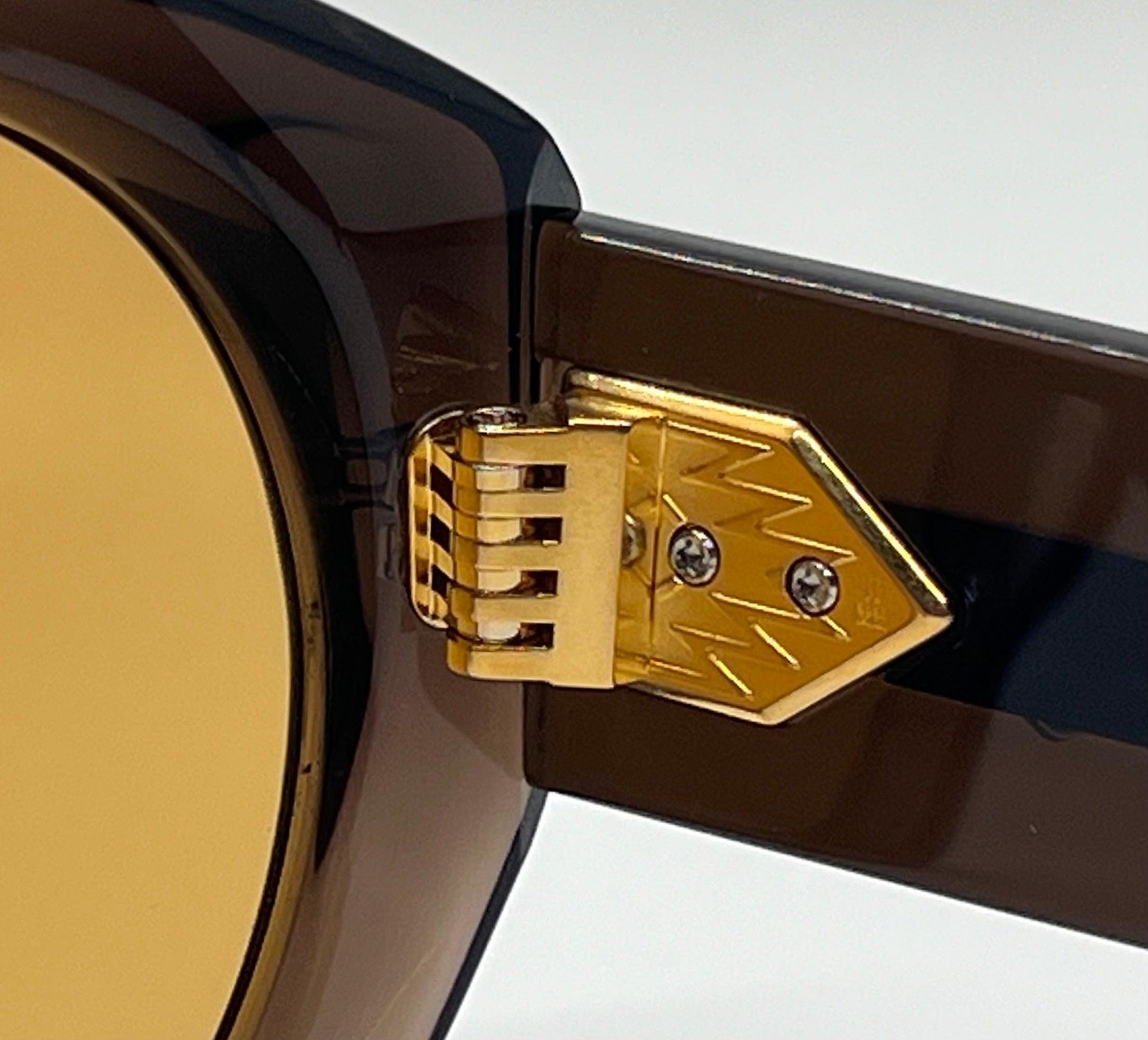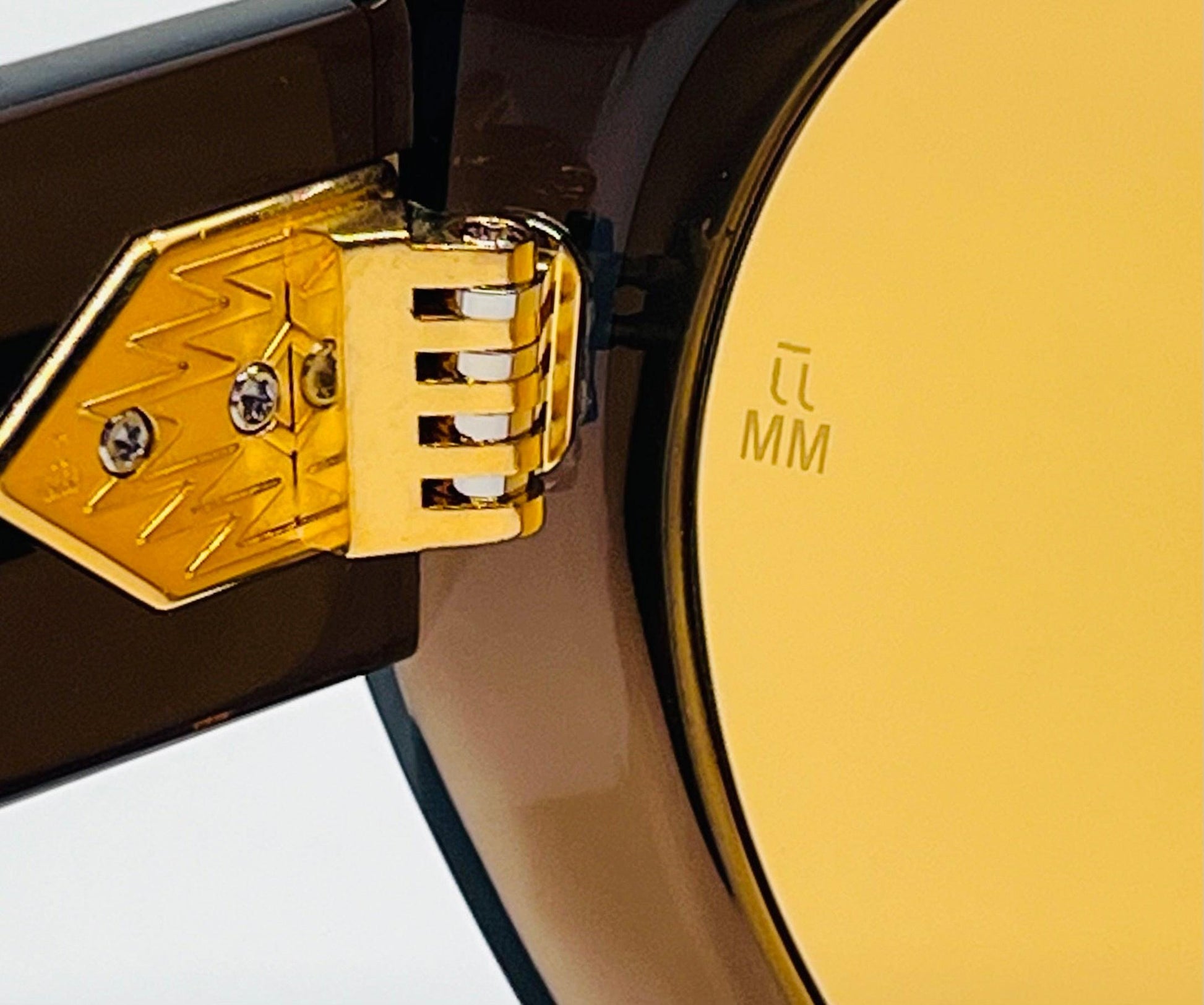 Frame Material: Brown 10mm cured cellulose acetate with custom double-laminated acetate temples featuring precious metal hardware and yellow lenses