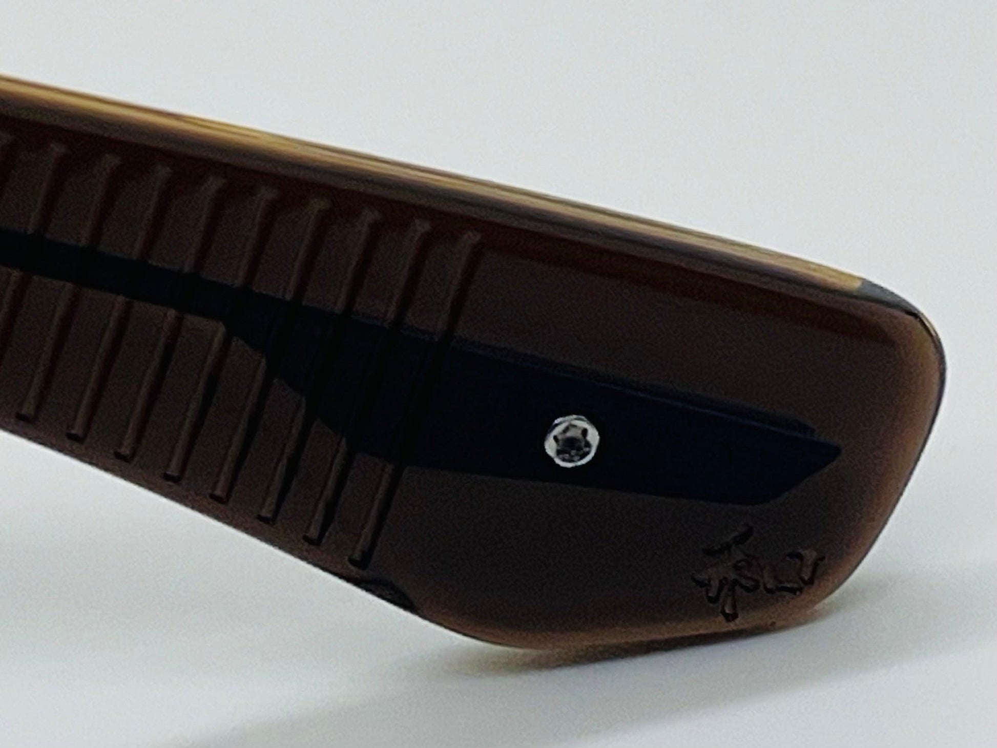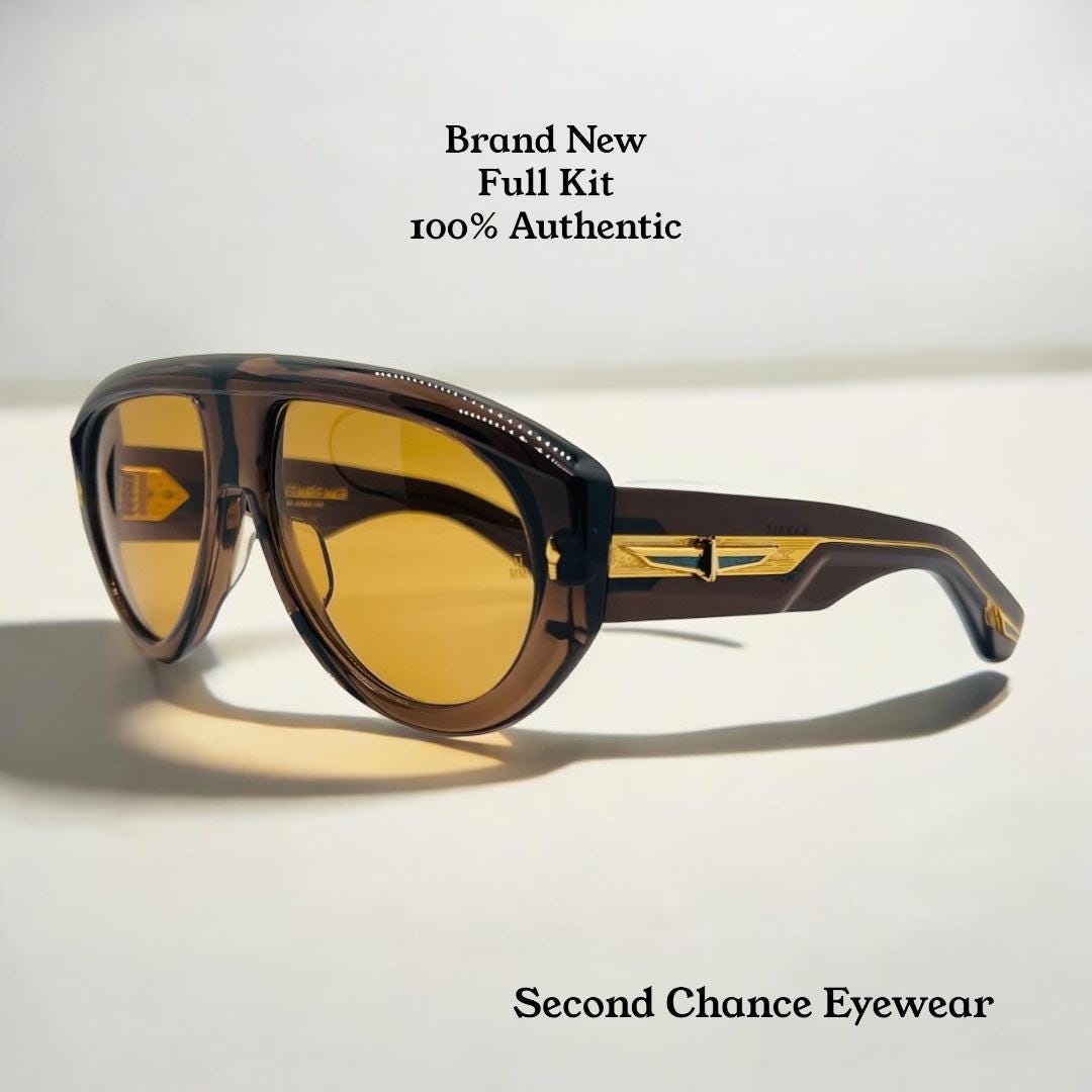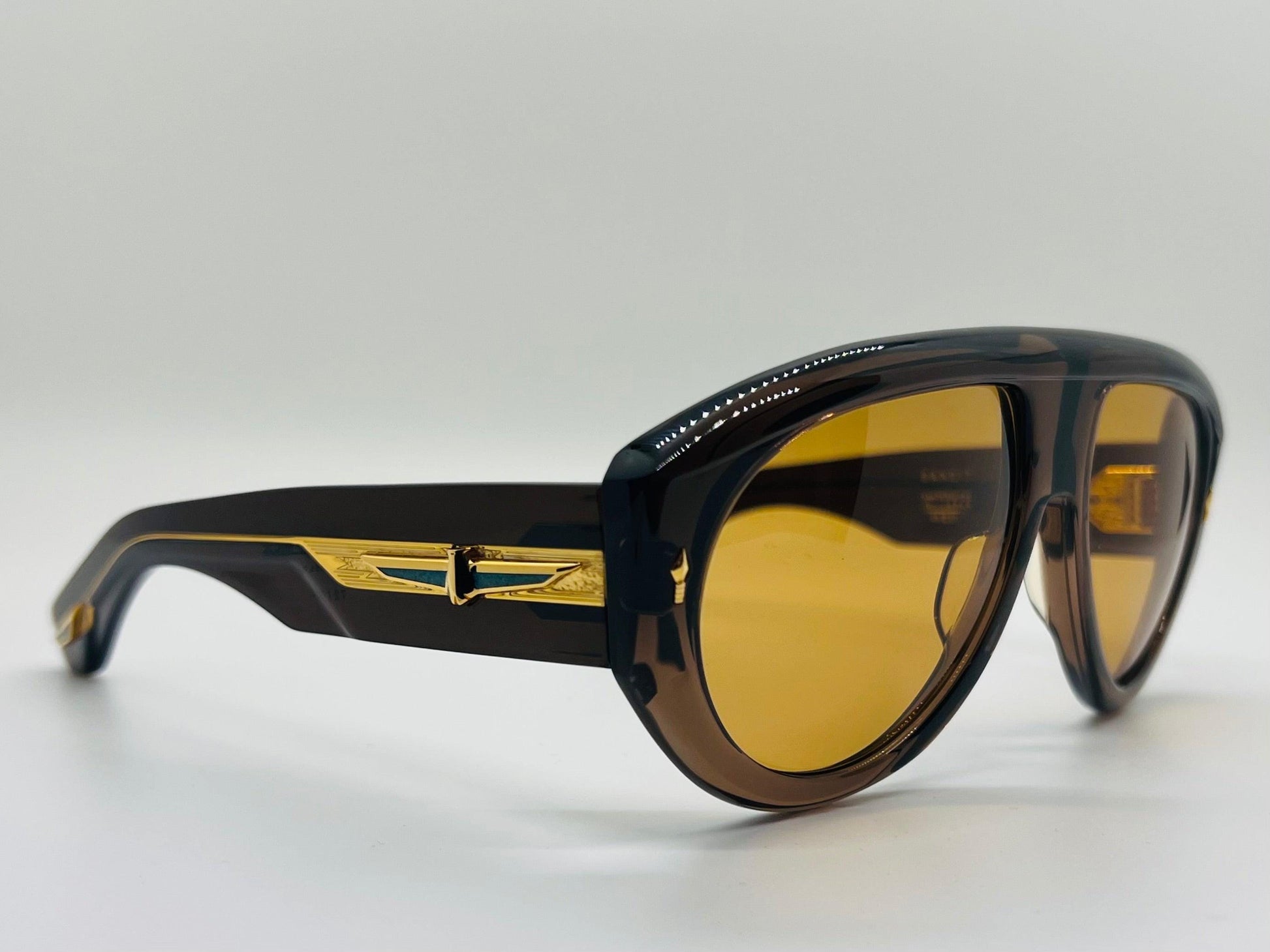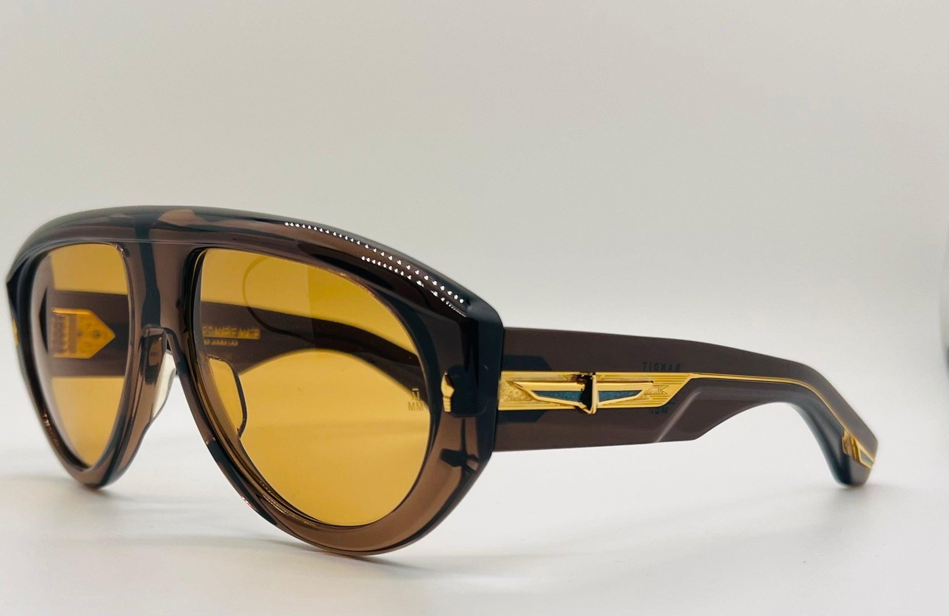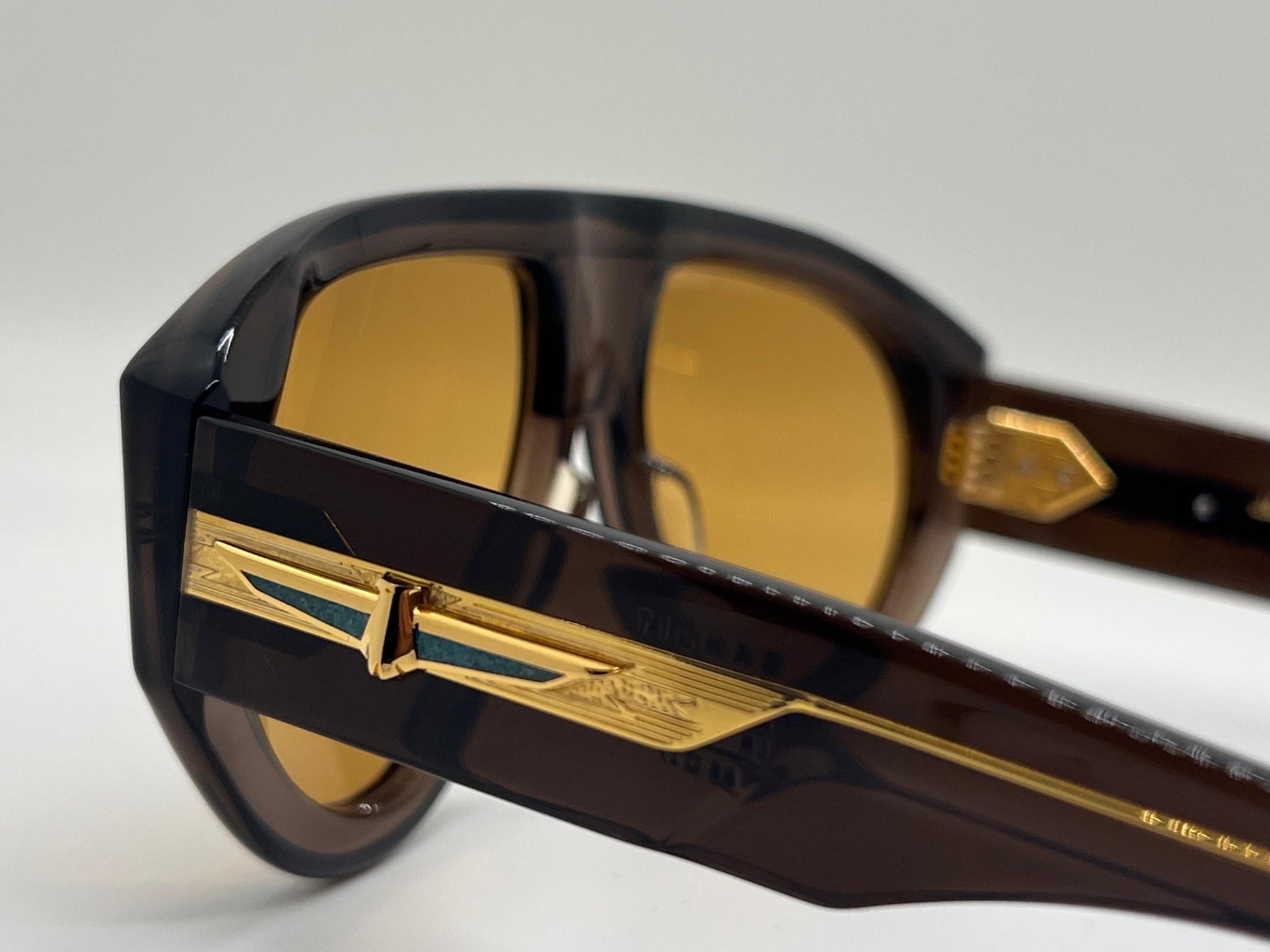 Frame Material: Brown 10mm cured cellulose acetate with custom double-laminated acetate temples featuring precious metal hardware and yellow lenses