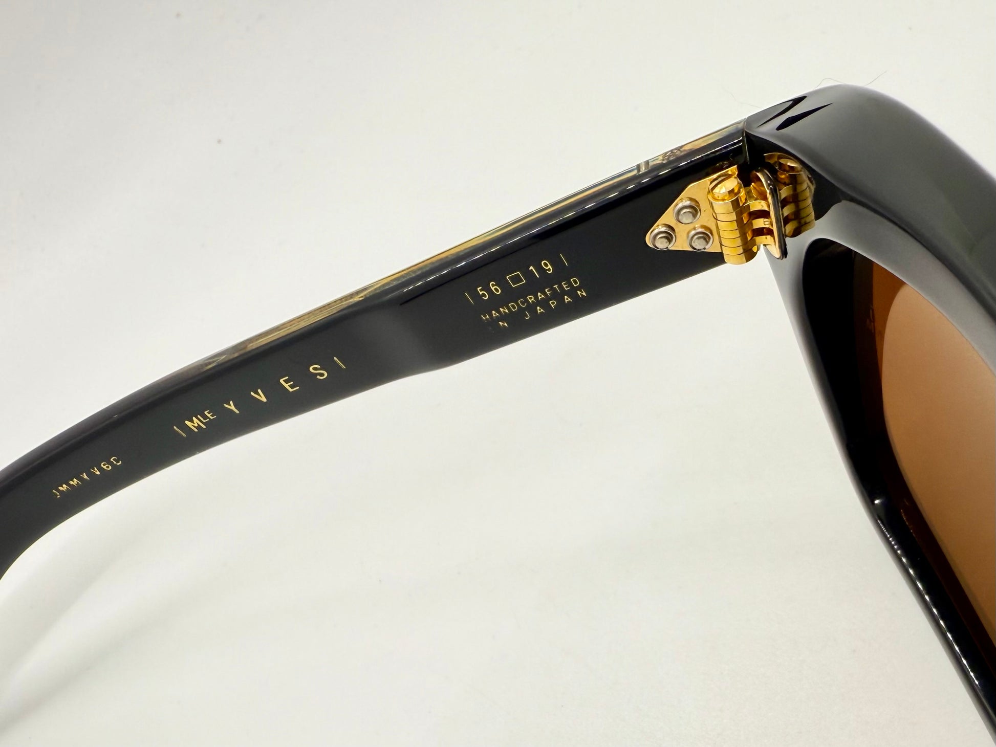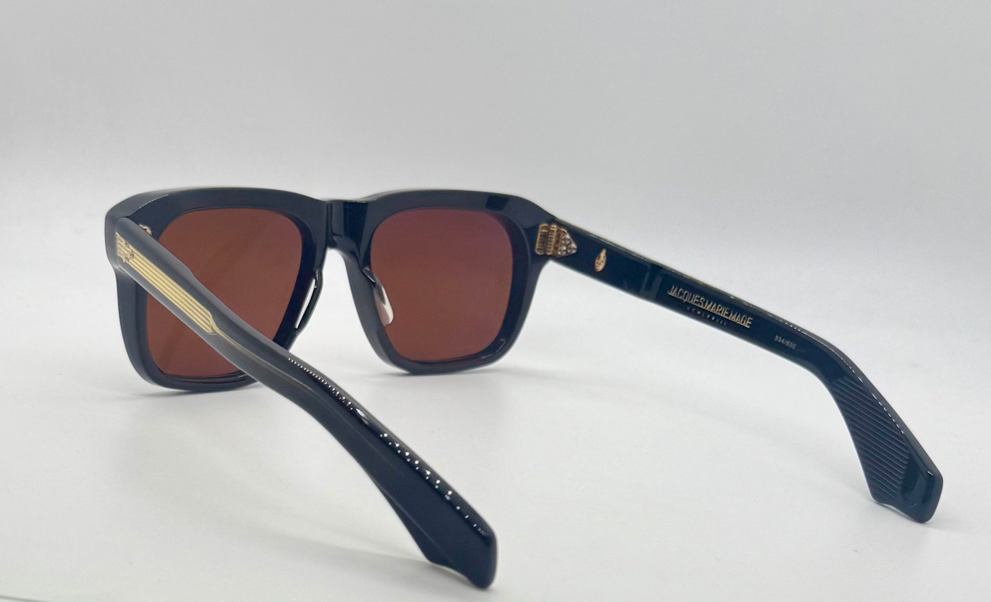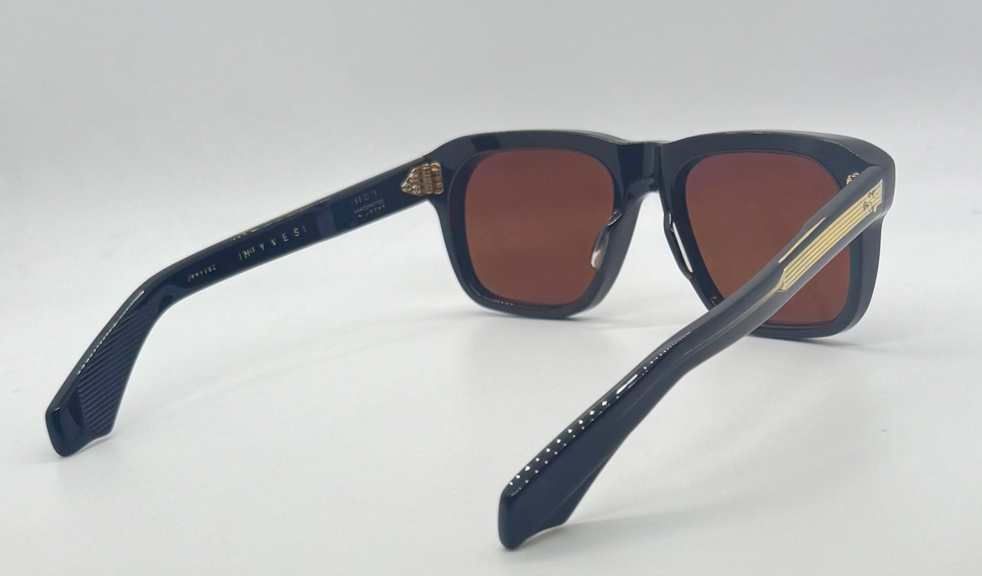 The Eclipse colorway combines a deep black acetate with a subtle cured translucence that shifts tone under light—paired with Dark Gold hardware, custom hairline-engraved wire core, and spur-shaped rivet hinges. The result is a statement piece that balances architectural strength with tailored sophistication.