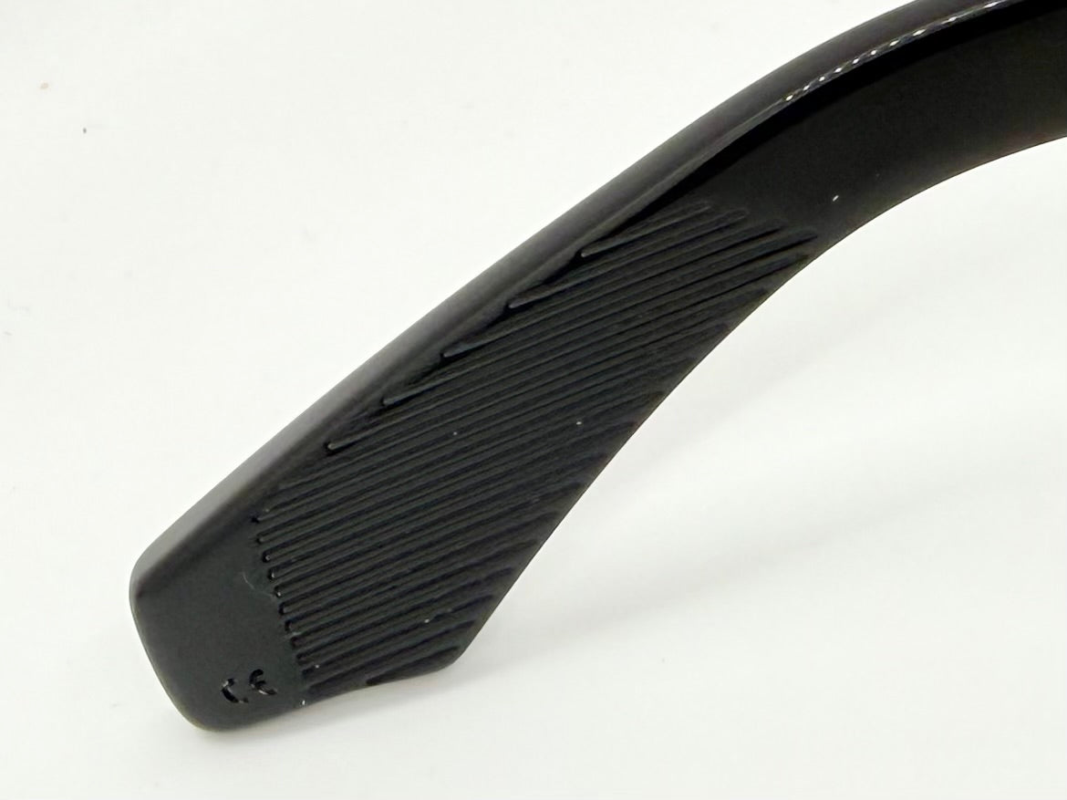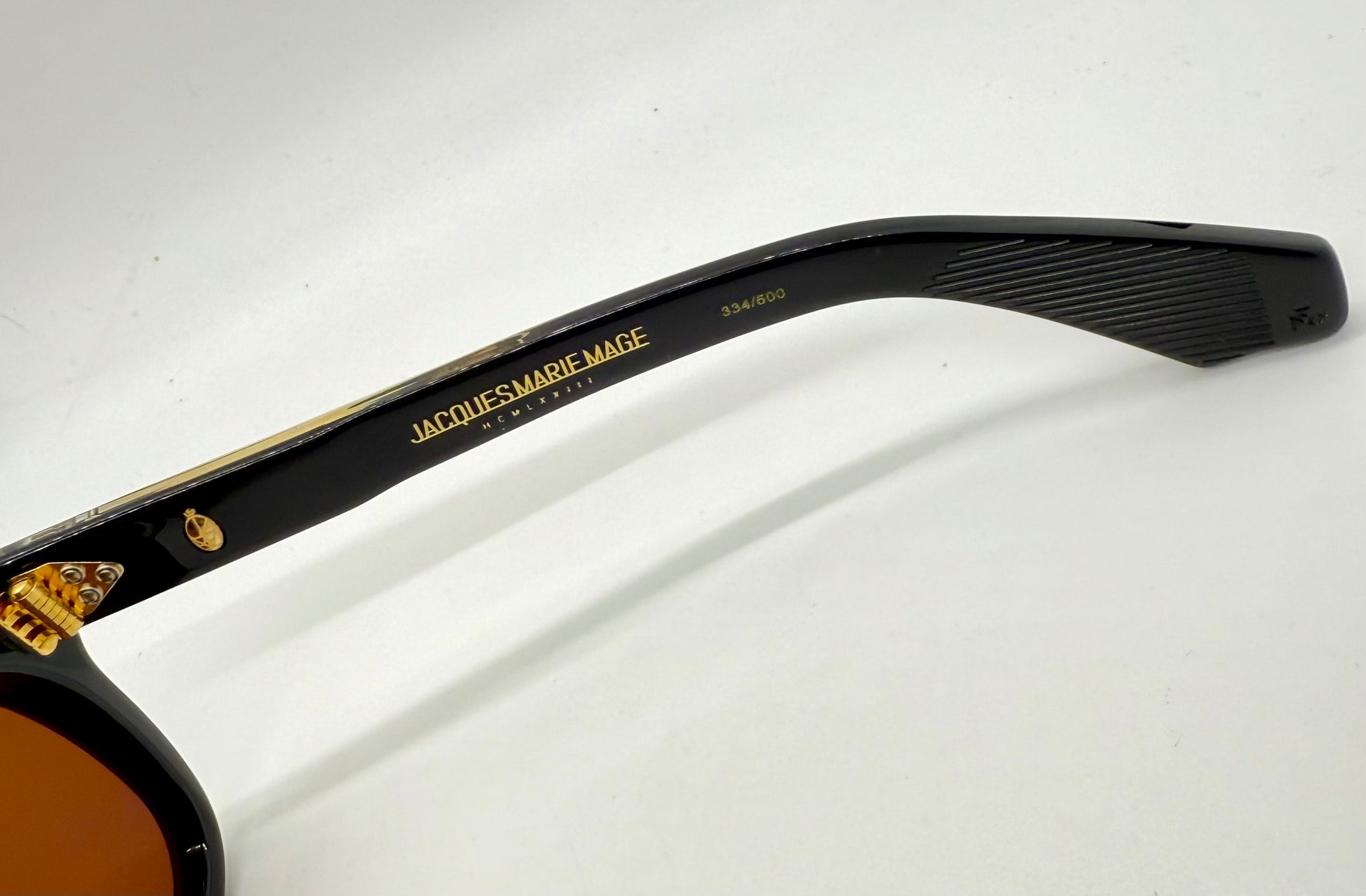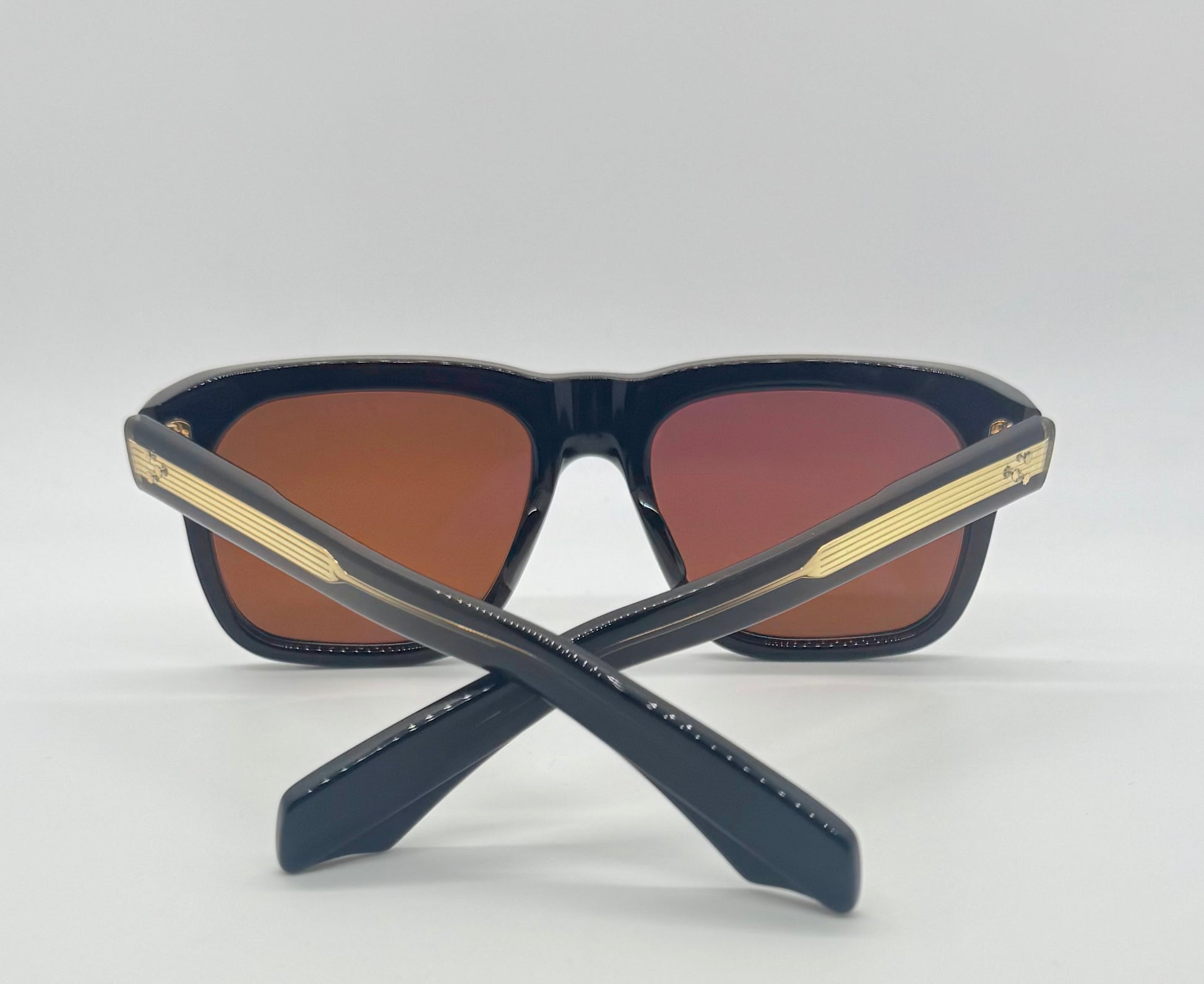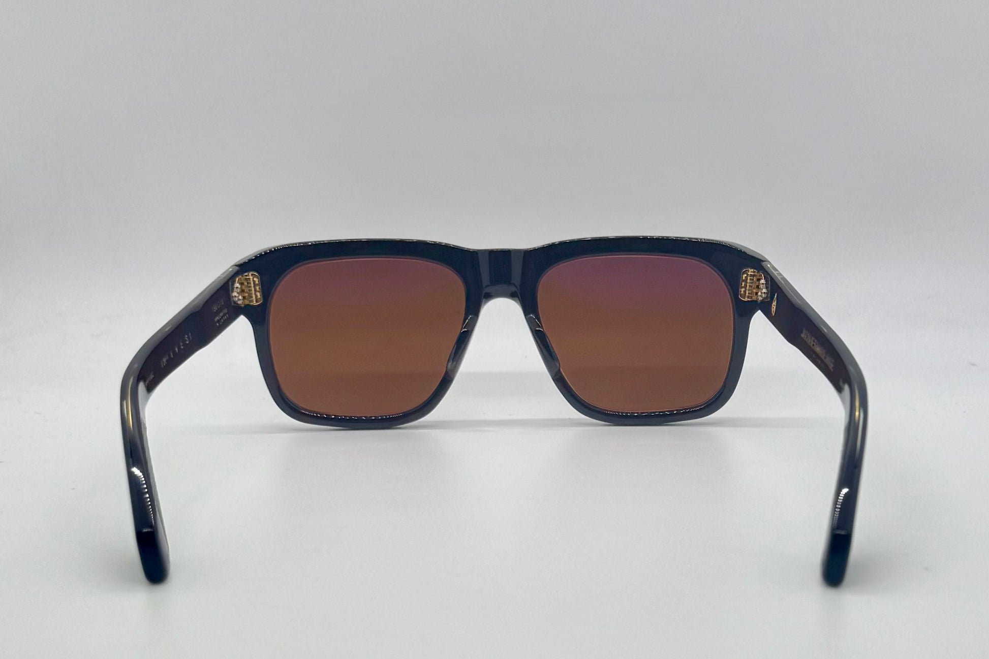 The Eclipse colorway combines a deep black acetate with a subtle cured translucence that shifts tone under light—paired with Dark Gold hardware, custom hairline-engraved wire core, and spur-shaped rivet hinges. The result is a statement piece that balances architectural strength with tailored sophistication.
