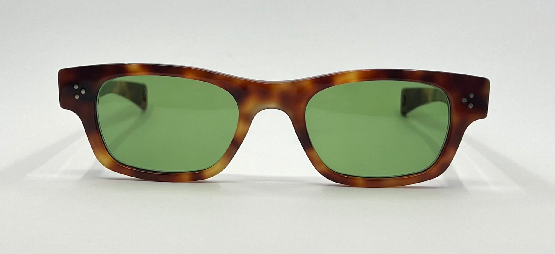 Substantial, hand-finished acetate with deep beveling and vintage-correct pinned rivets at front and temples