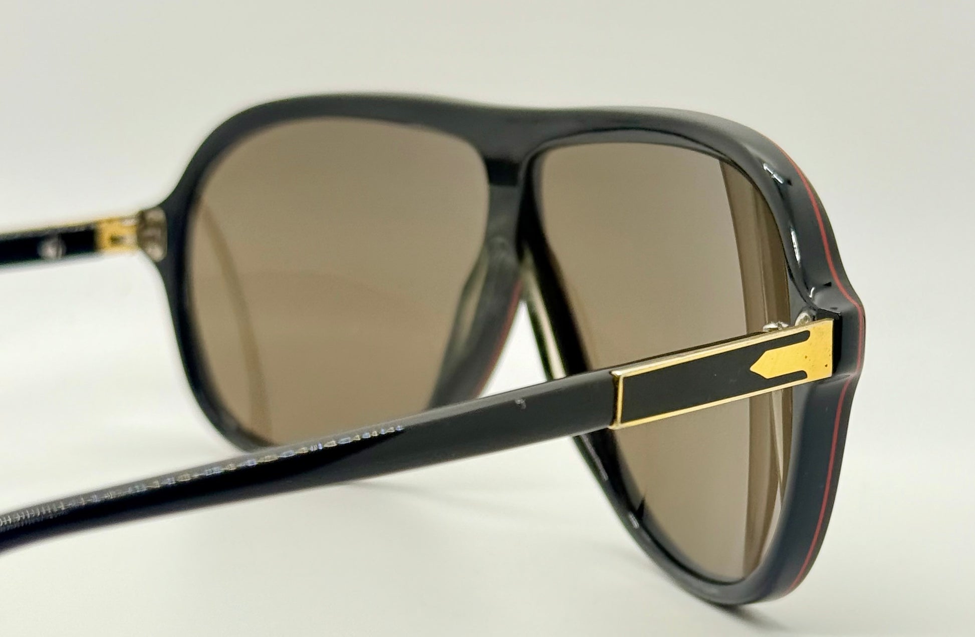 Unlike most Ratti models, this Manager-line variant was built with solid non-Meflecto temples, making it an uncommon and highly collectible configuration. With its oversized 65 mm aviator silhouette, black acetate construction, and striking red inner rim piping, it captures the essence of Italian luxury design from the era.