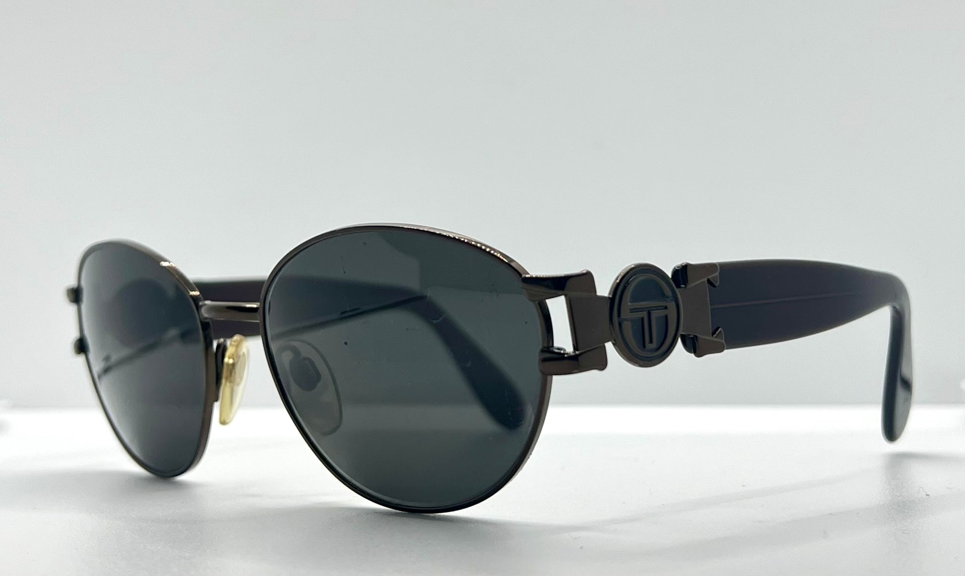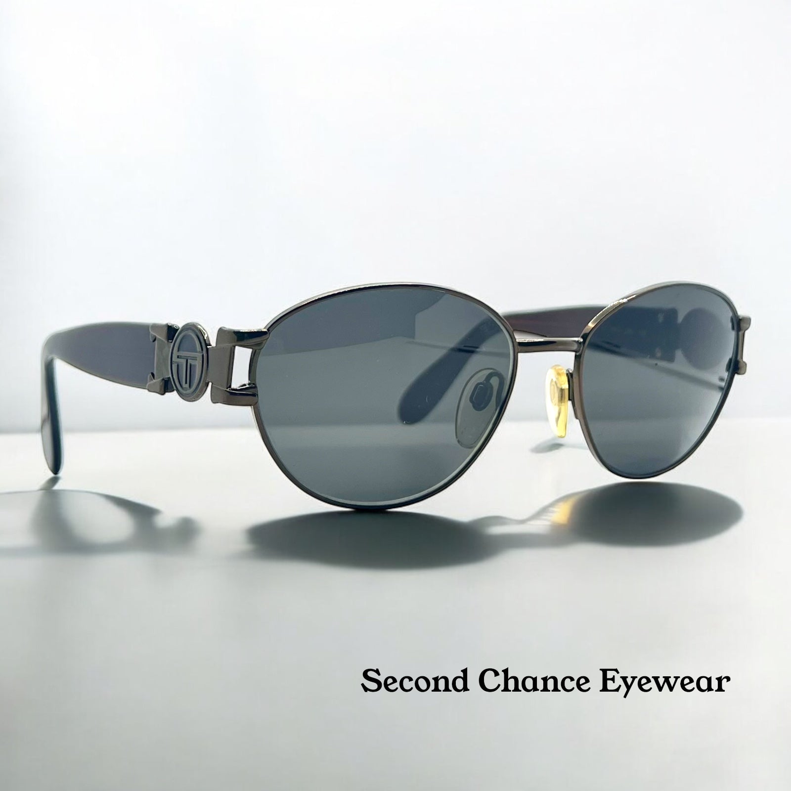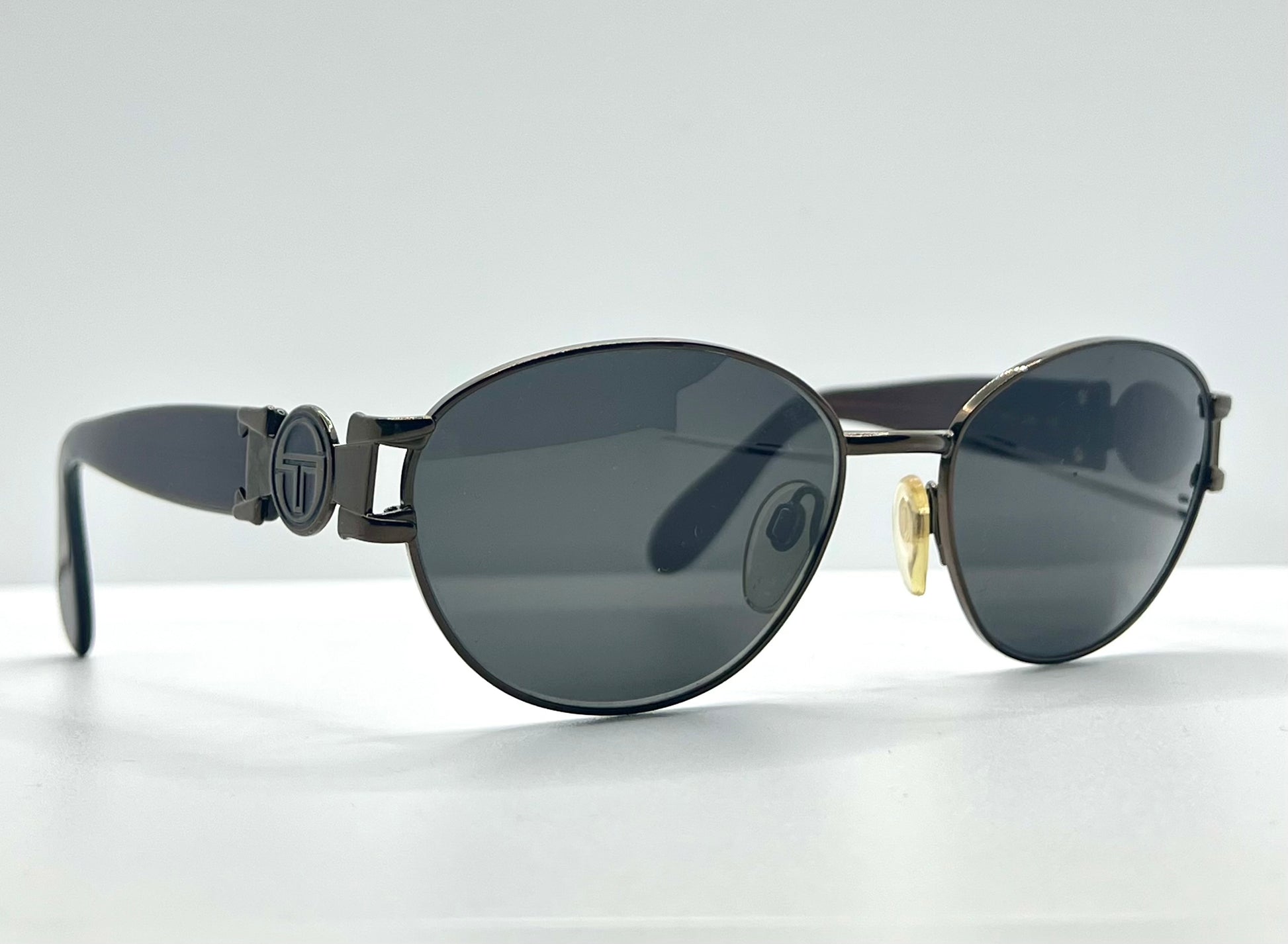 A rare Deadstock find from Sergio Tacchini, the S.T. 1056-S is a timeless example of Italian craftsmanship and sporty luxury. This vintage pair features a sleek gunmetal wraparound metal front with black insert temples, paired with dark grey/black original lenses for excellent sun protection and a clean, stylish silhouette.
