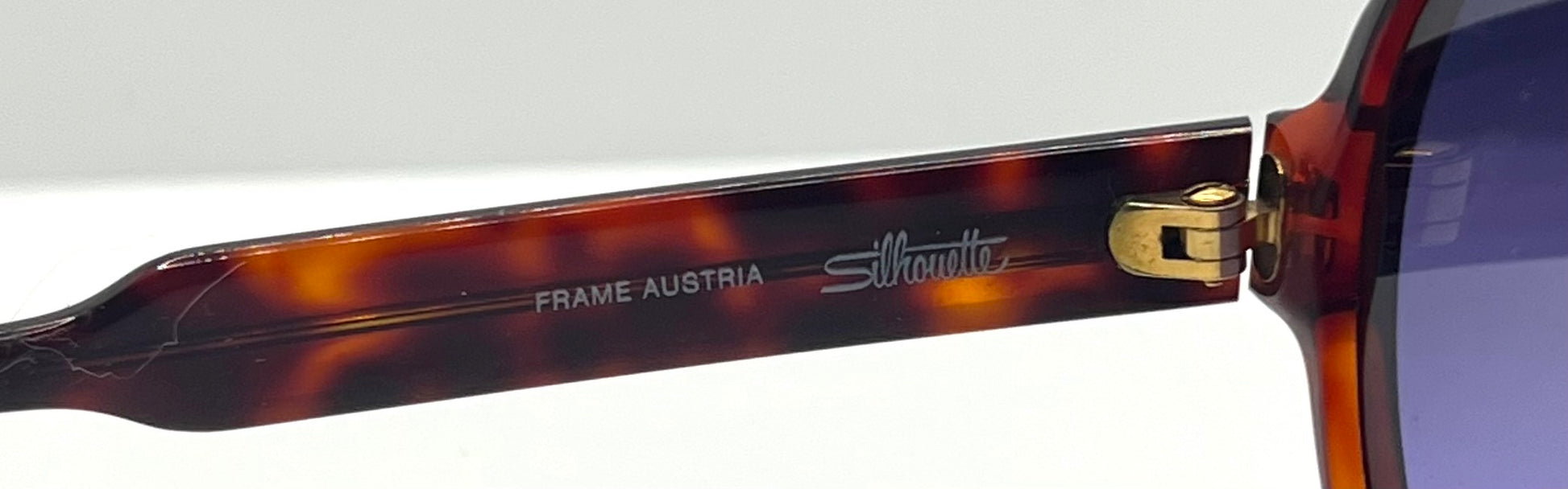 A standout late-1980s silhouette from Silhouette, this bold yet clean aviator design combines tortoiseshell acetate with gold hardware for an effortlessly refined look. Designed and manufactured in Austria, this model remains a rare find in deadstock condition—now enhanced with a fresh, modern twist through the custom violet gradient lenses. Functional, flattering, and timeless, these sunglasses embody the best of vintage luxury with contemporary flair.