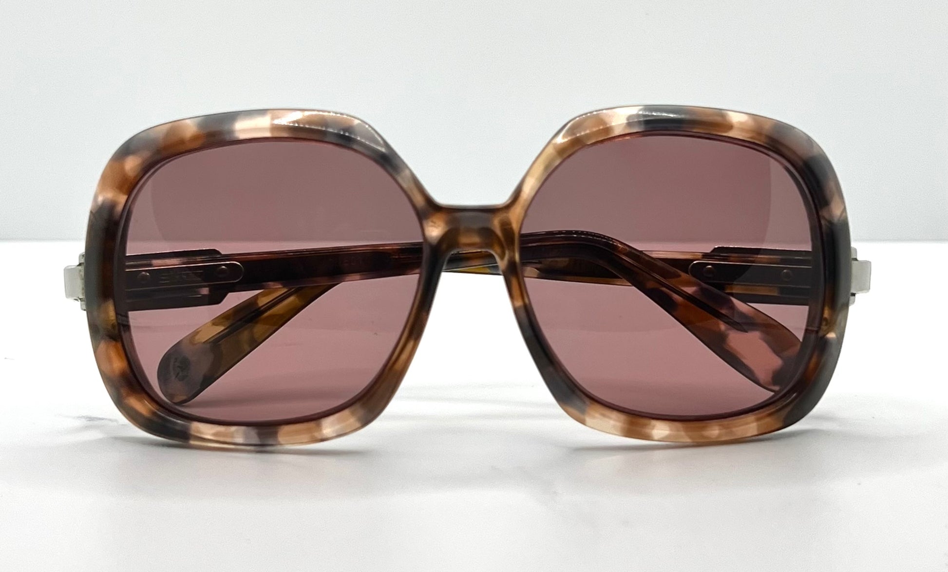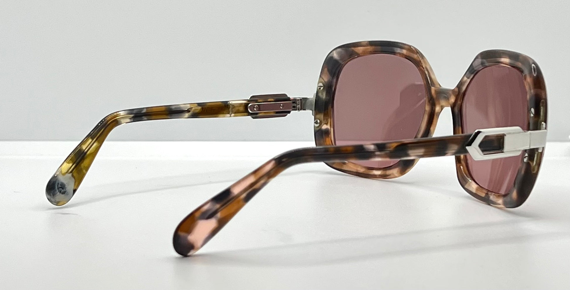An exceptionally preserved example from Silhouette’s late-1970s to early-1980s archive. Oversized square fronts in richly layered tortoise acetate meet signature geometric metal hinges for a bold yet elegant silhouette. Now custom-fitted with brand new Solid Deep Rose lenses – a moody plum-rose tone with subtle purple undertones.