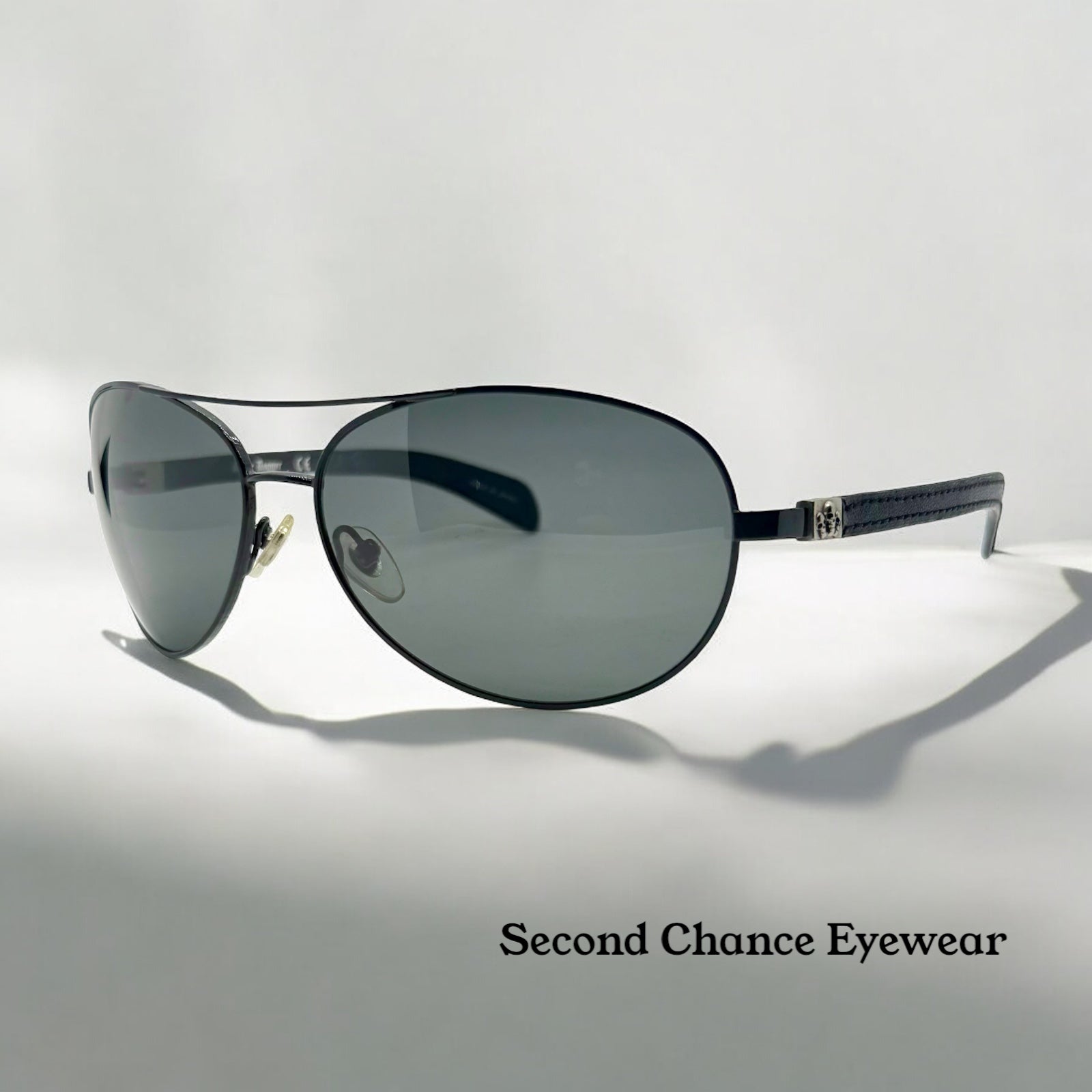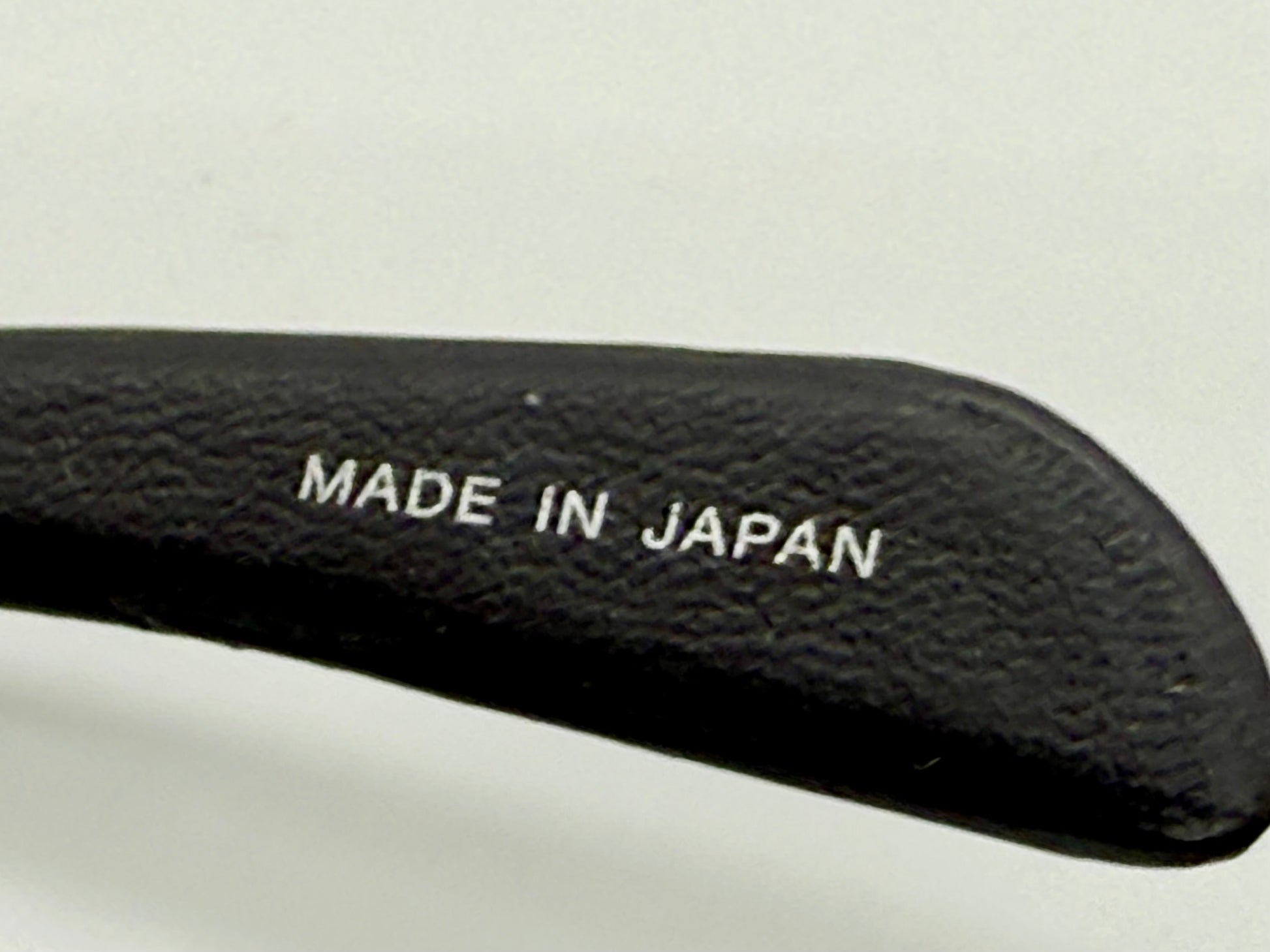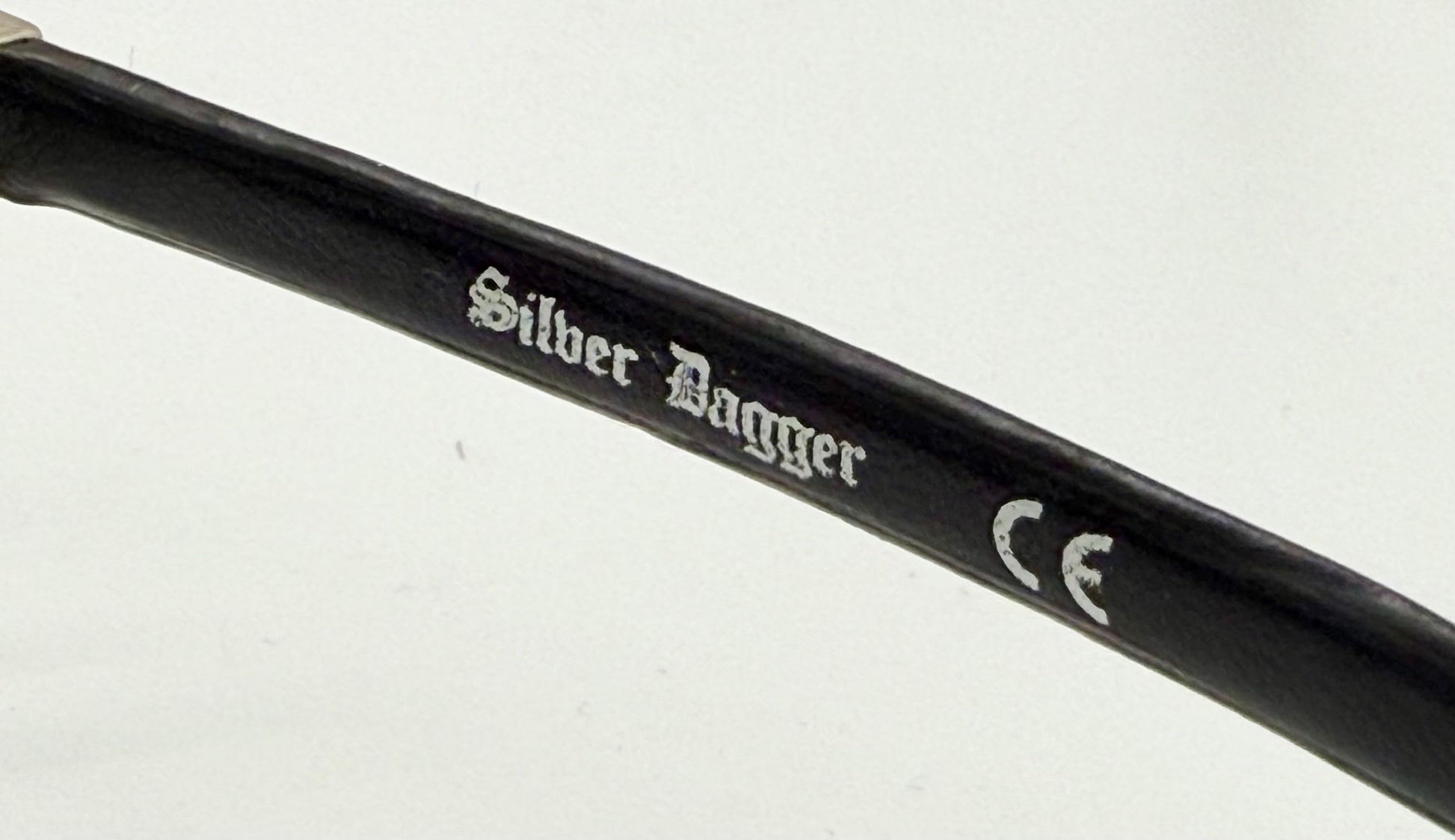 This Japan-made aviator frame features a lightweight gloss black metal construction with leather-wrapped temples, skull hardware, and custom-branded nose pads—signature details that embody Silver Dagger’s rebellious spirit. Fitted with brand new polarized lenses by Second Chance Customs, this pair delivers crystal-clear clarity, UV protection, and everyday wearability while preserving its collectible value.