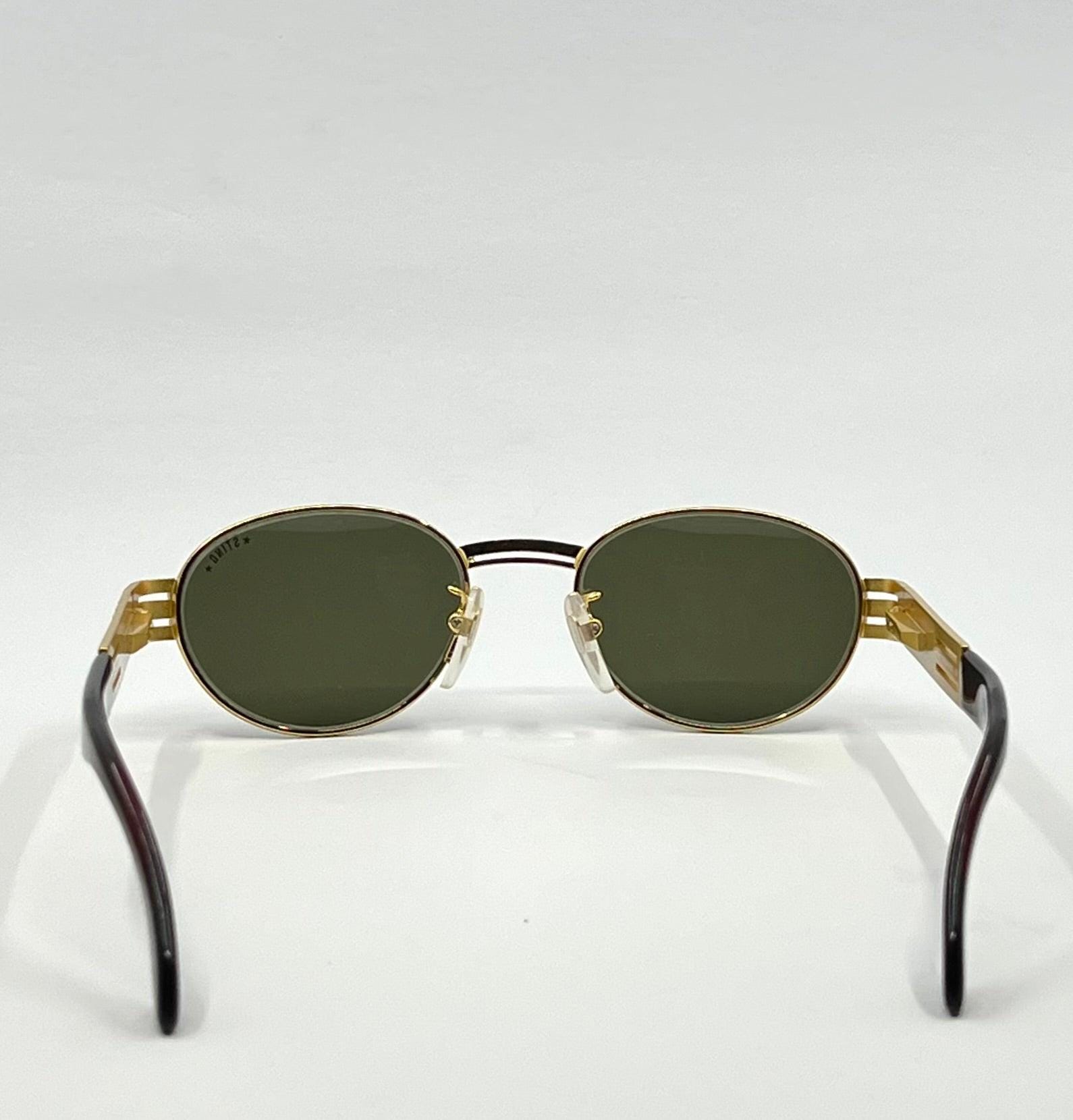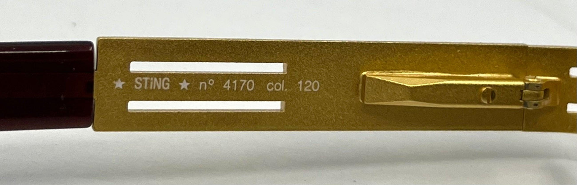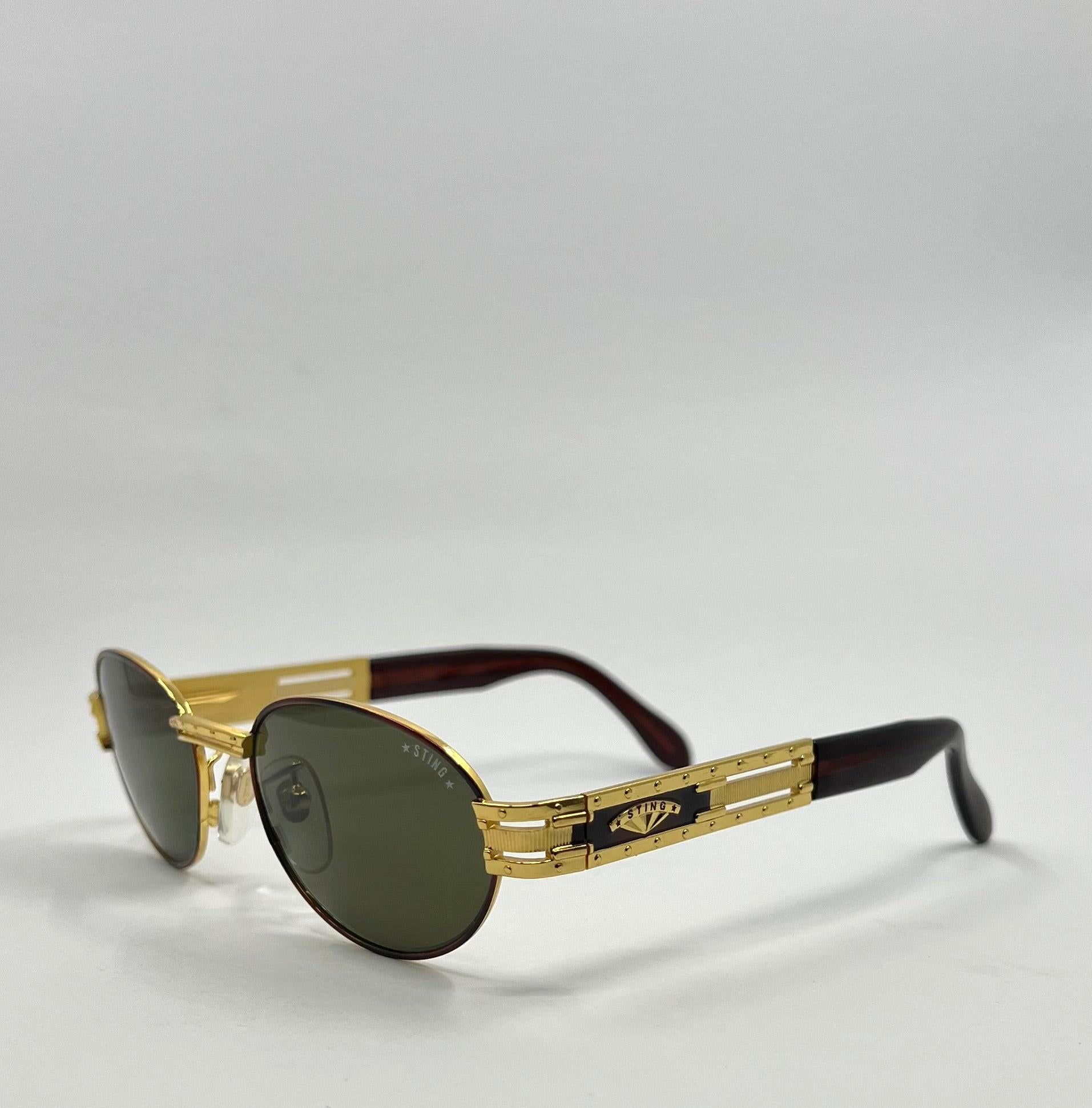 • Style: Oval lens shape with striking gold-plated temples featuring cutout details and embossed STING logo badge. Dark green lenses with original factory etching.