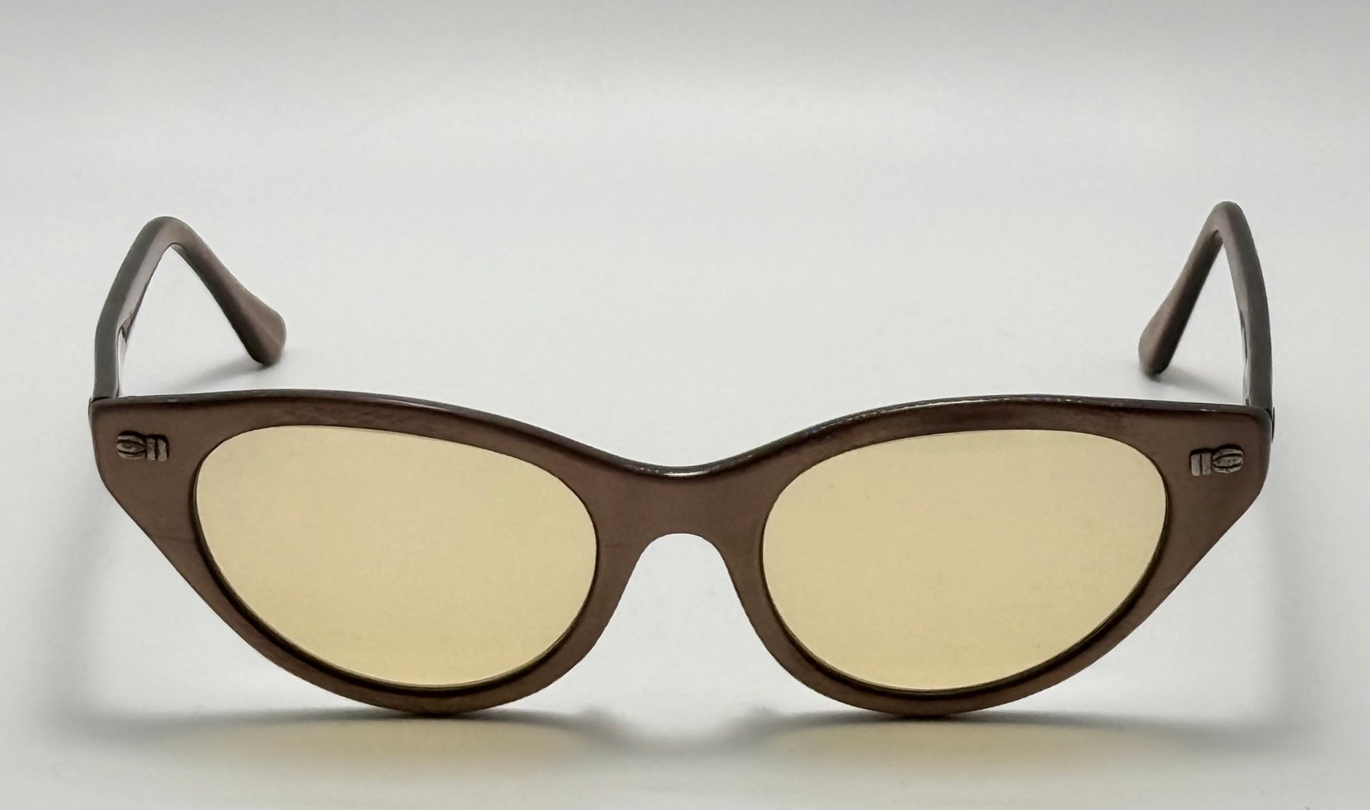 Step into vintage American eyewear craftsmanship with the TITMUS 5 1/2, a classic industrial frame reimagined with modern custom lenses. This cat-eye silhouette combines a striking textured bronze acetate frame with Berko's Designs Amber Honey Burnt lenses, creating a warm, refined aesthetic perfect for both collectors and daily wear.
