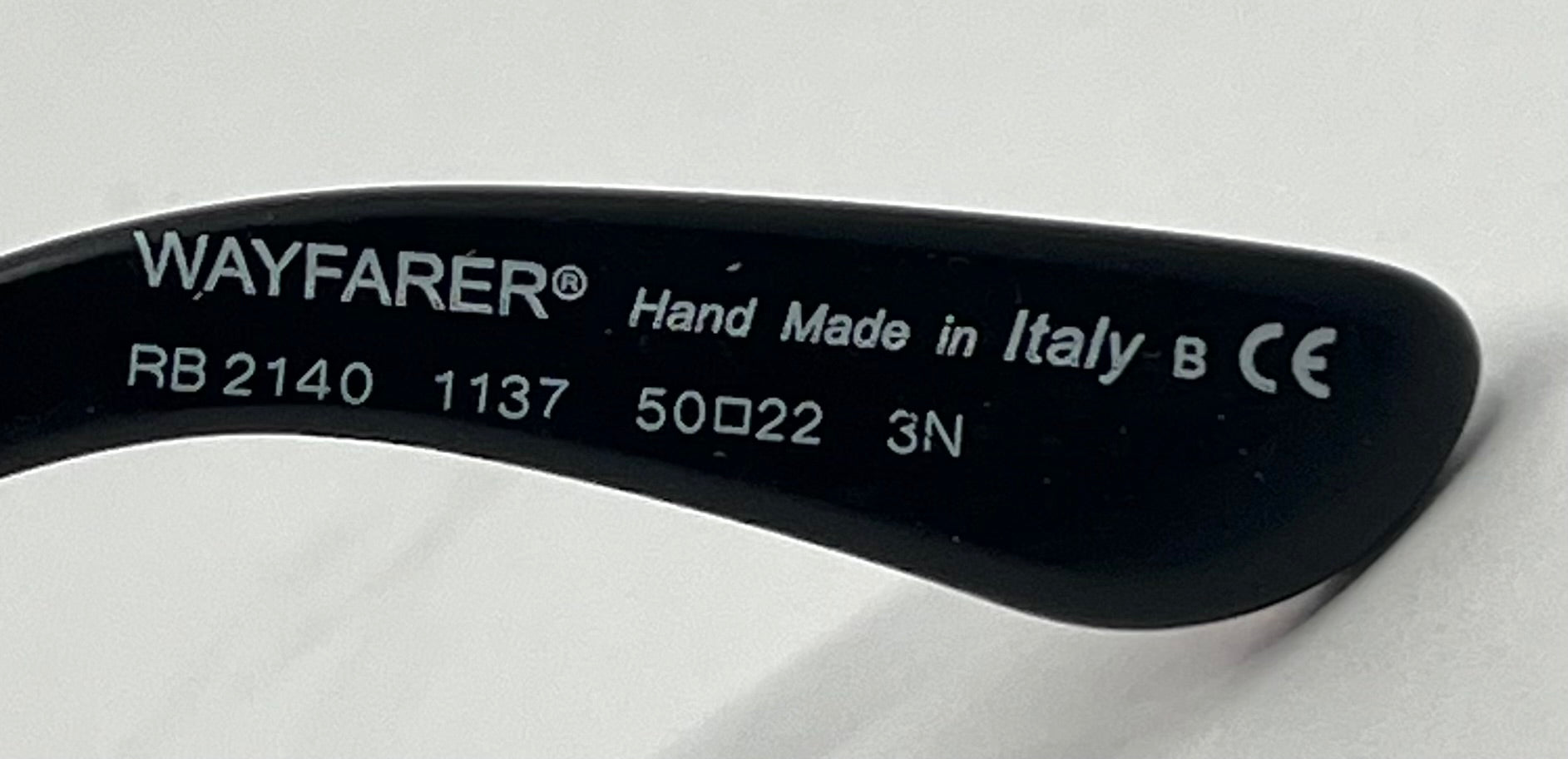 “SPECIAL SERIES #11” and “RB2140 1137 50□22 3N / WAYFARER® Hand Made in Italy B CE.” - Authentic RB laser etch on left lens, correct for mineral glass production.
